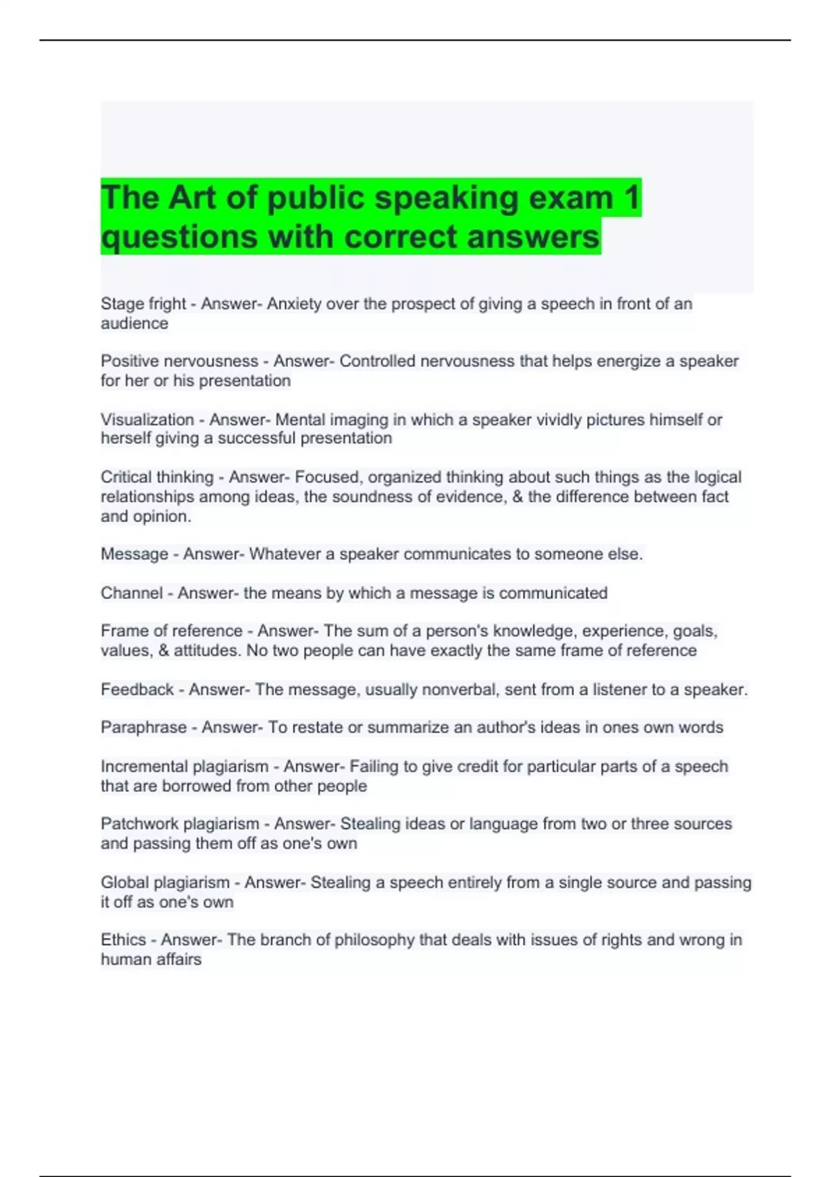 1 Exam (elaborations) The Art of public speaking exam 1 questions with correct answers 2024 2 Exam (elaborations) mThe Art of Public Speaking 11th Edition - Review Questions -- Chapters 1, 2, 3, 6, 7, 8, 9, 10, 13, 14, 15, 16, 17, 18, 19 -with correct Answers 3 Exam (elaborations) Public Speaking, Exam 1 study guide (chapters 1-5) Questions and A