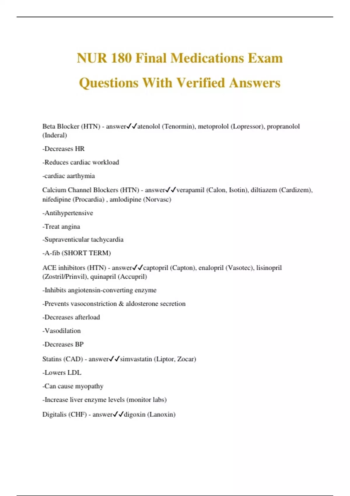 NUR 180 Final Medications Exam Questions With Verified Answers