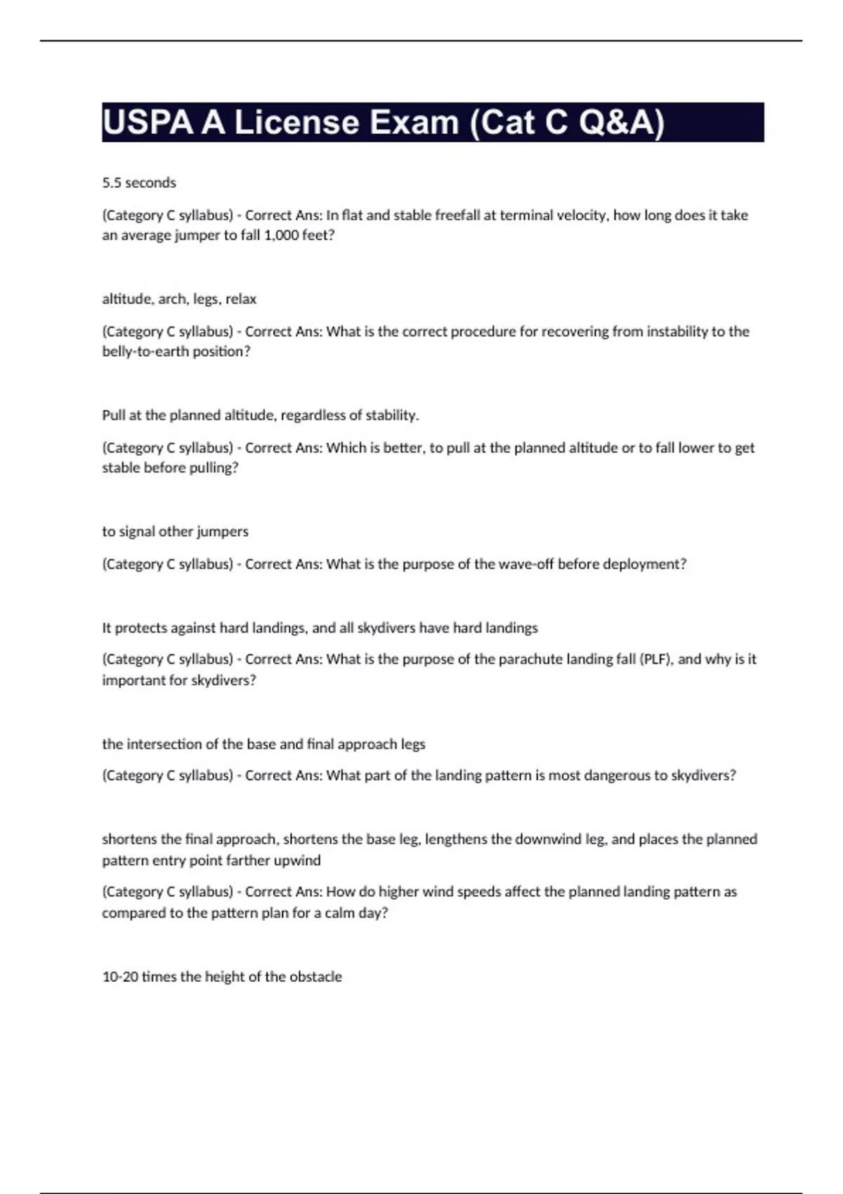 USPA A License Exam Questions and Complete Answers Bundle Compilation Graded A+