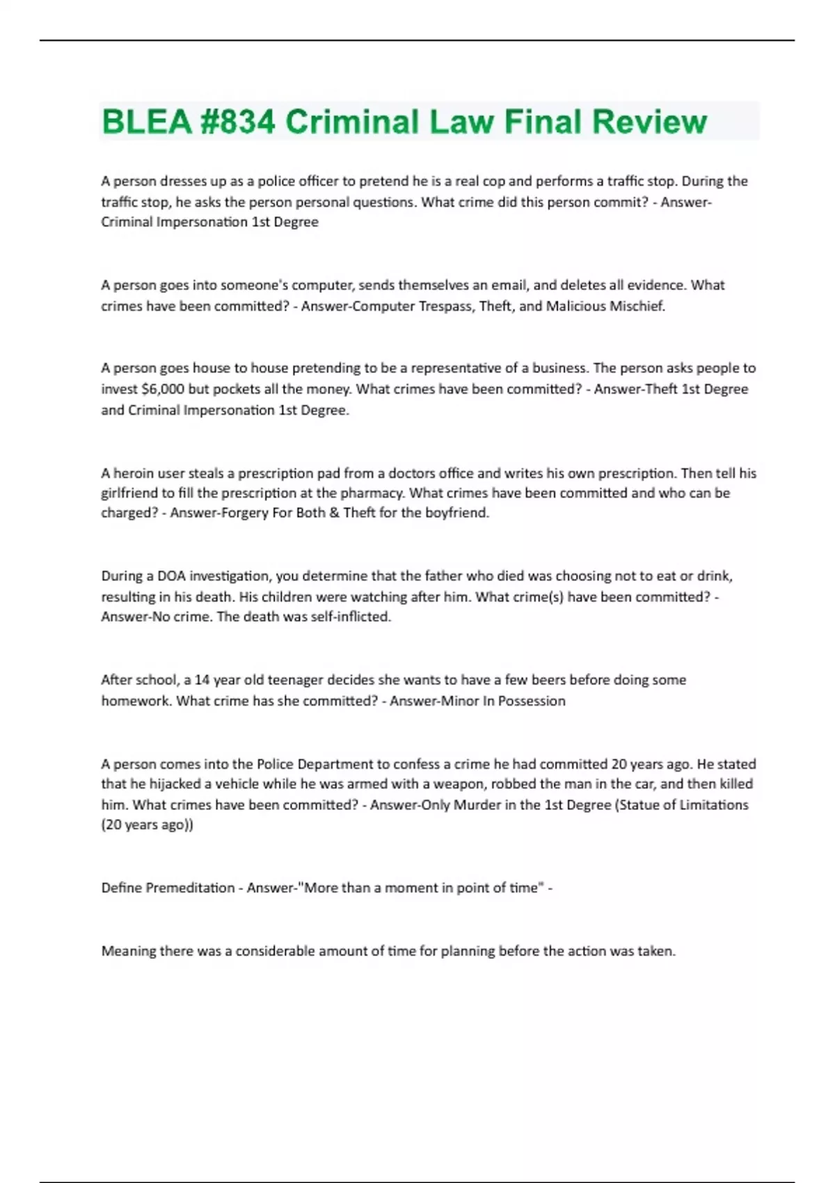 BLEA #834 Criminal Law Final Review Questions with well explained answers