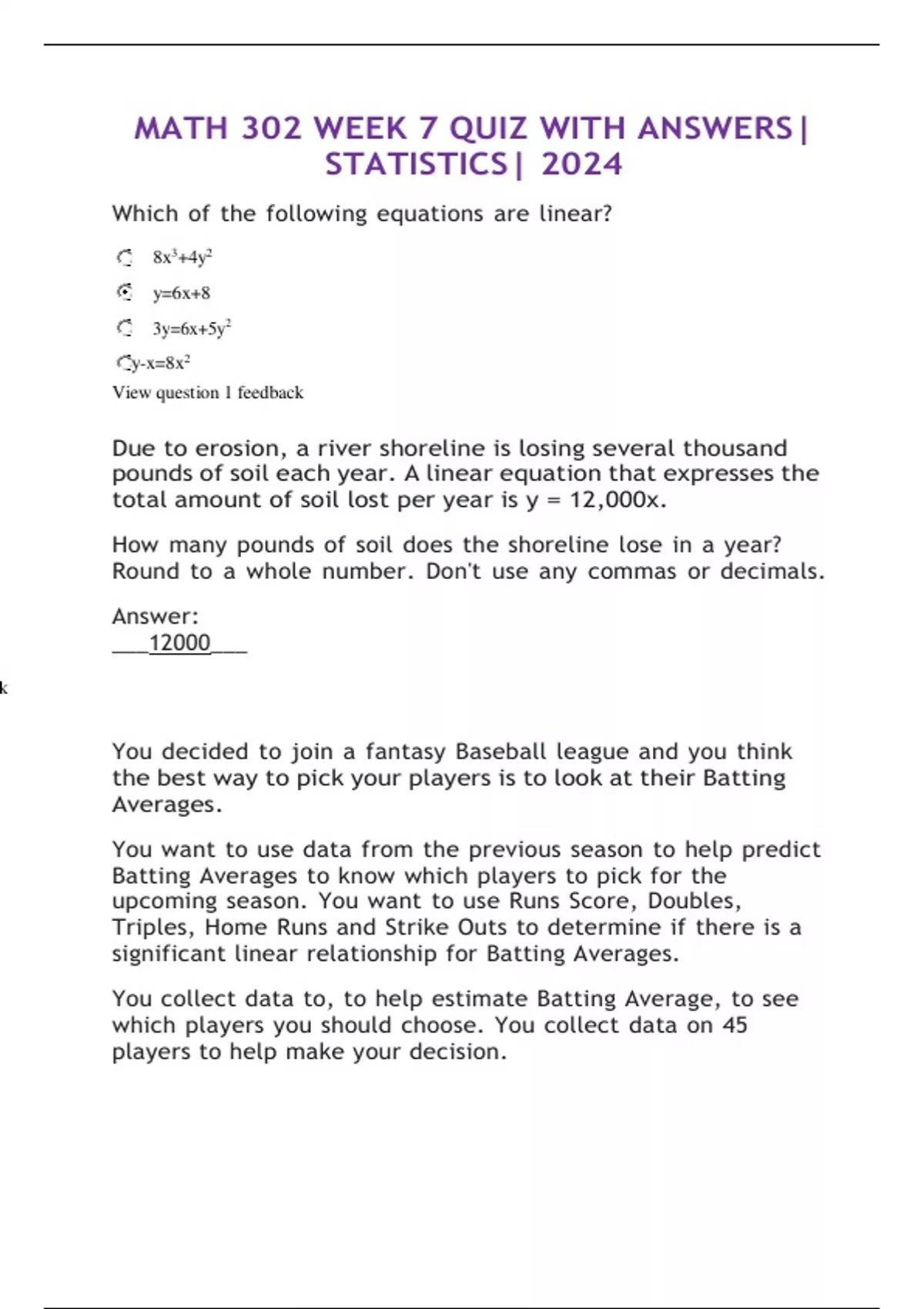 MATH 302 WEEK 7 QUIZ WITH ANSWERS| STATISTICS| 2024
