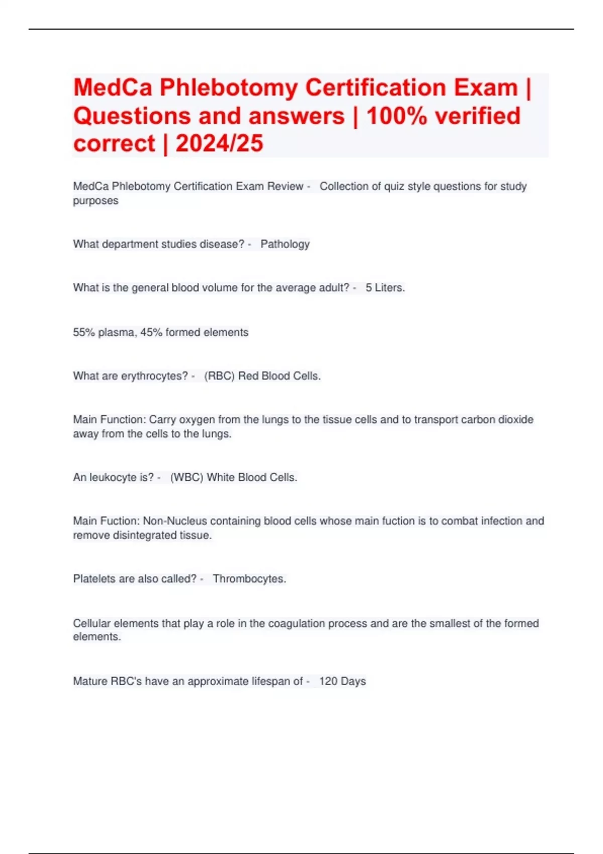 Exam (elaborations) MedCa Phlebotomy Certification Exam | Questions and answers | 100% verified correct | 2024/25 2 Exam (elaborations) MEDCA PHLEBOTOMY EXAM | WITH COMPLETE SOLUTION | UPDATED 2024/25 3 Exam (elaborations) MEDCA exam study guide Phlebotomy | with complete solution 2024/25