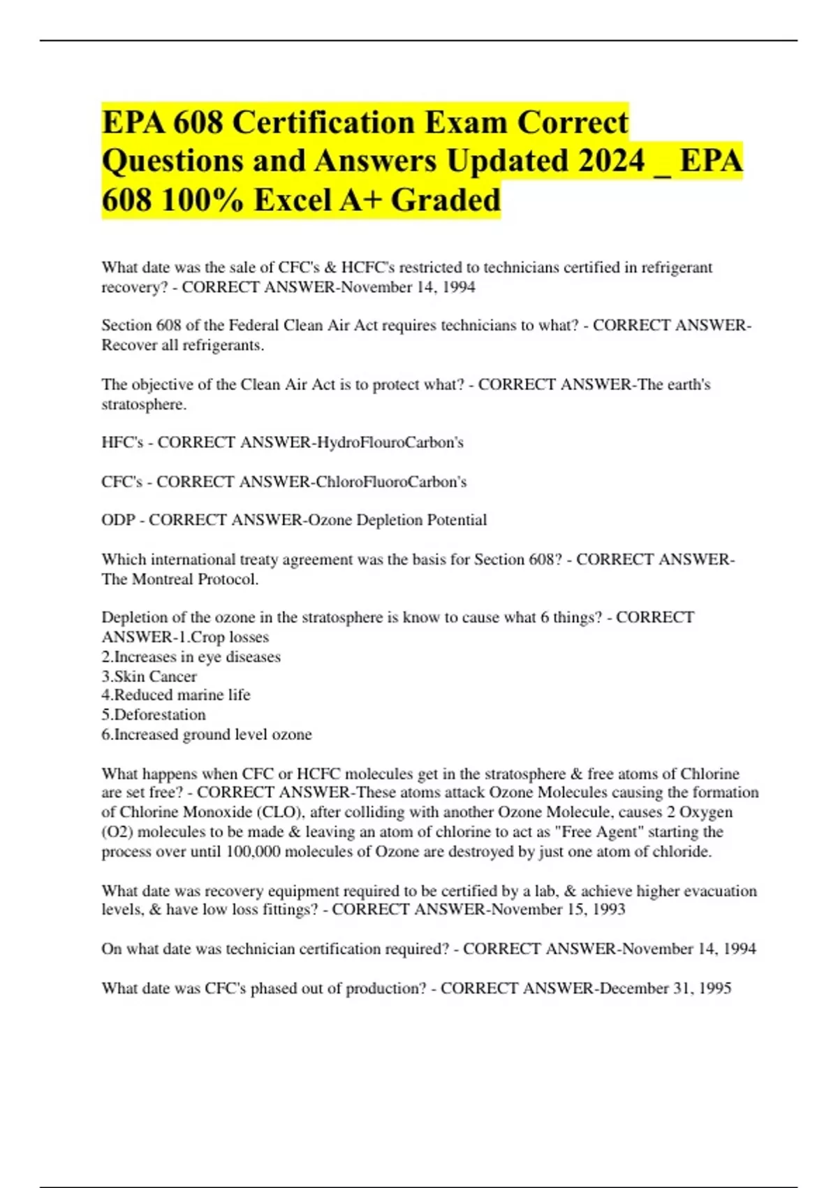 EPA 608 study material including (Core, type 1, 2 and 3) Questions and Answers 100% A+ Graded plus other great study items Package Deal A+ 100%