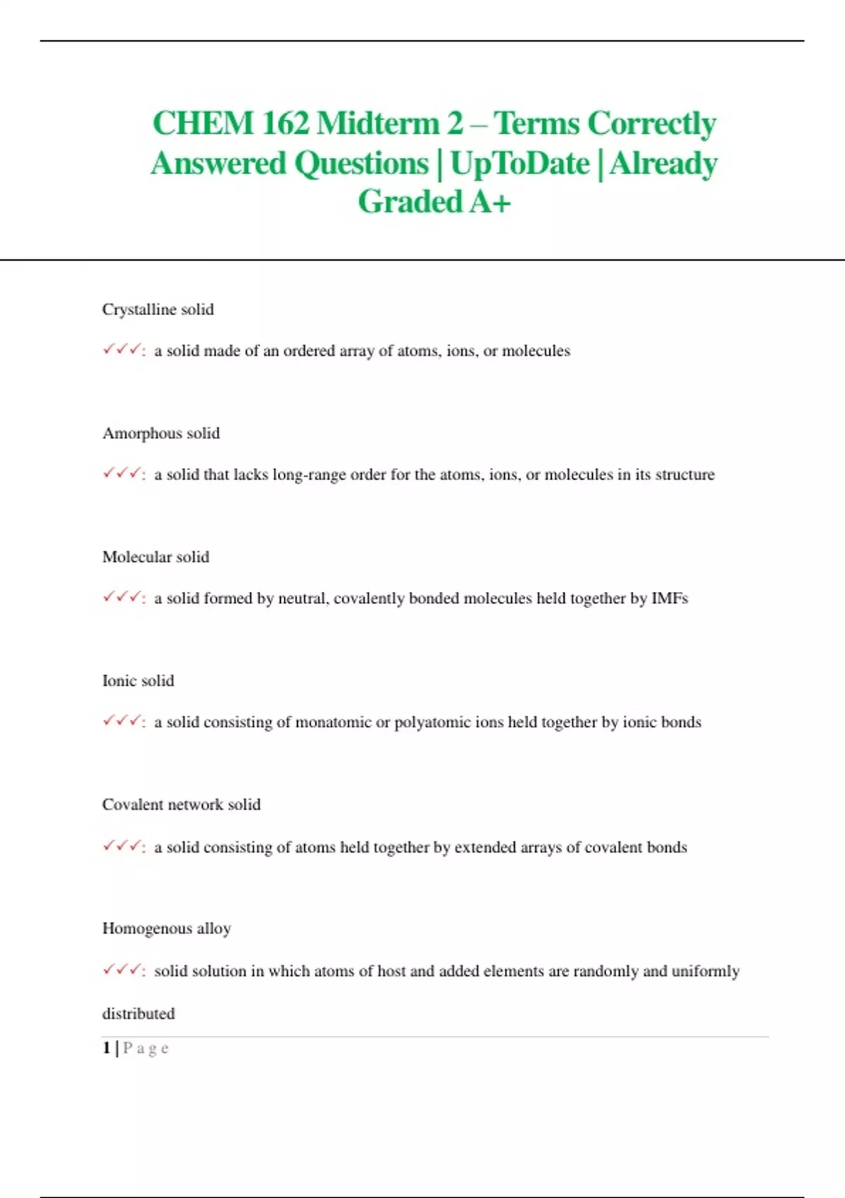 CHEM 162 Midterm 2 –Terms Correctly Answered Questions| UpToDate | Already Graded A+