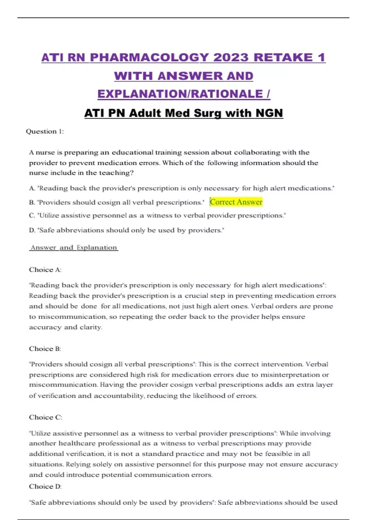 ATI RN PHARMACOLOGY 2023 RETAKE 1 QUESTIONS WITH ANSWERS AND EXPLANATIONS /RATIONALE