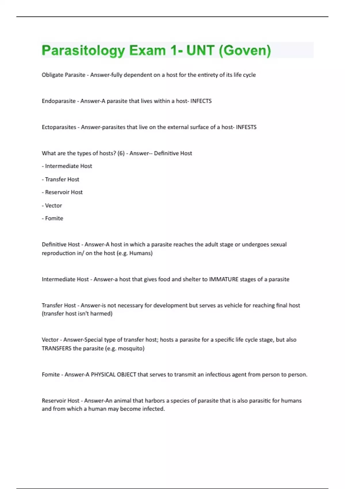 Parasitology Exam 1- UNT (Goven) questions and answers all are correct