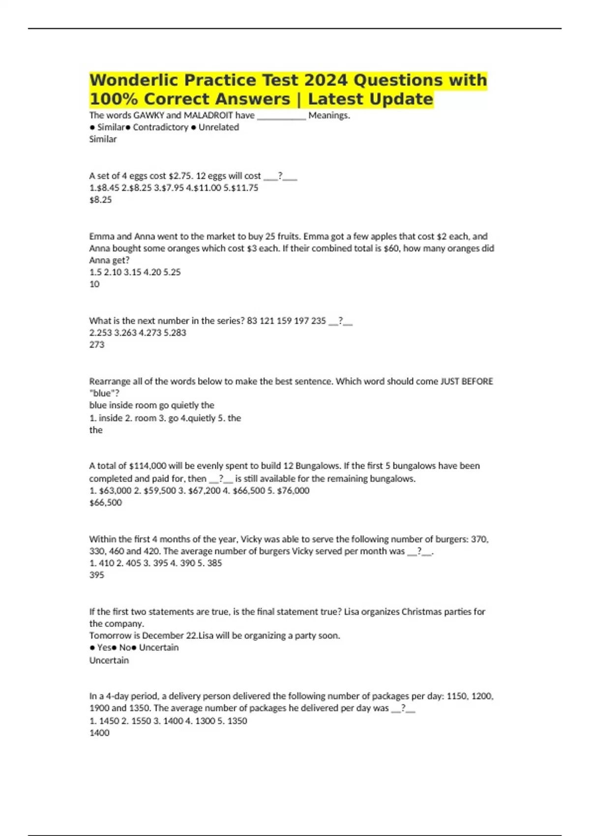 Wonderlic Exam Questions with 100% Correct Answers | Latest Update Graded A+