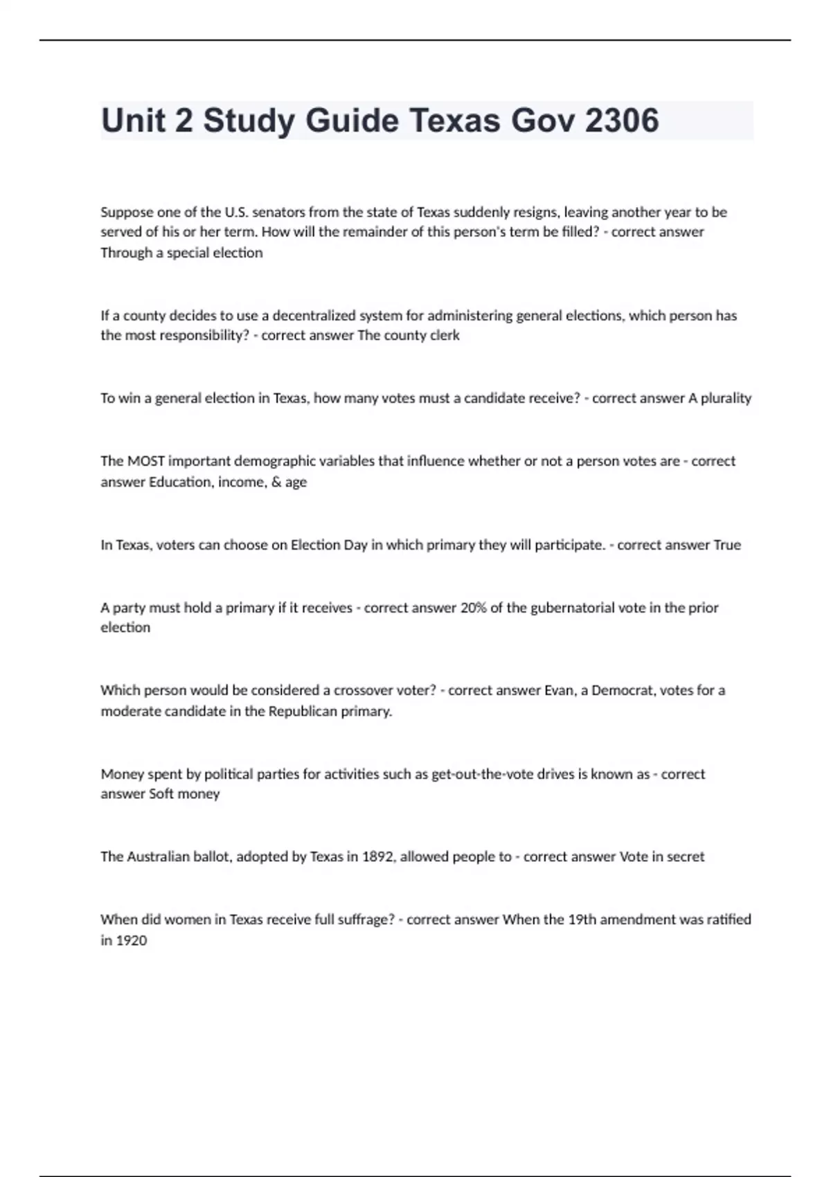 Texas Gov 2306 Collin College -Texas Government 2306: Exam 2 correctly answered graded A+