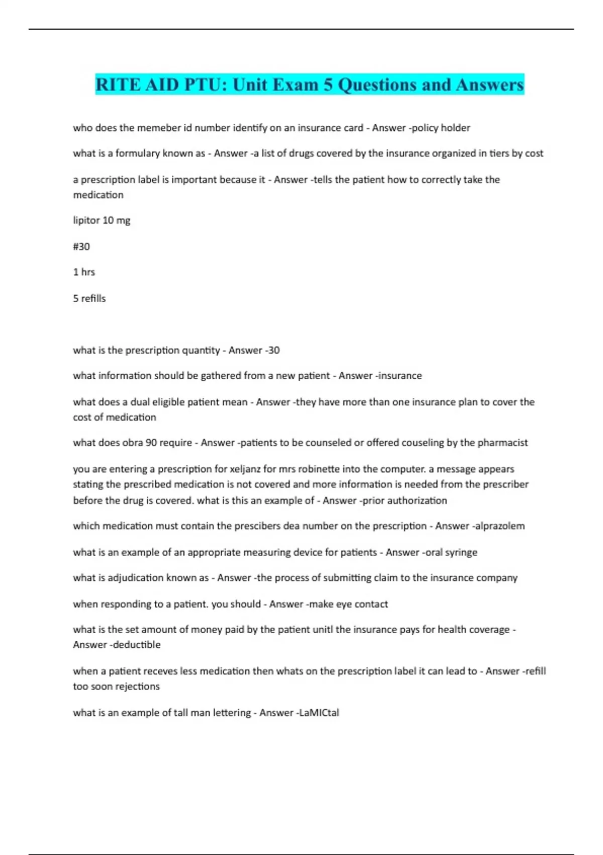 Bundle for RITE AID PTU with Correct Solutions 2024 | 2025. Actual tests, Exam prep, final exams, exam study guide, Unit 1-7,