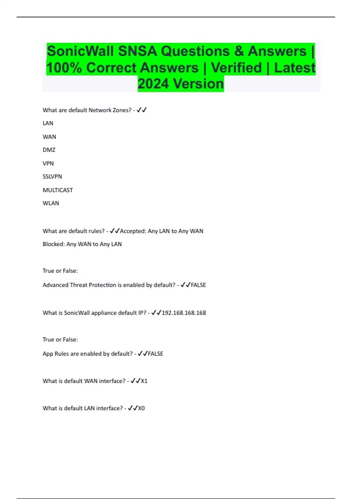 SonicWall SNSA Questions & Answers | 100% Correct Answers | Verified | Latest 2024 Version