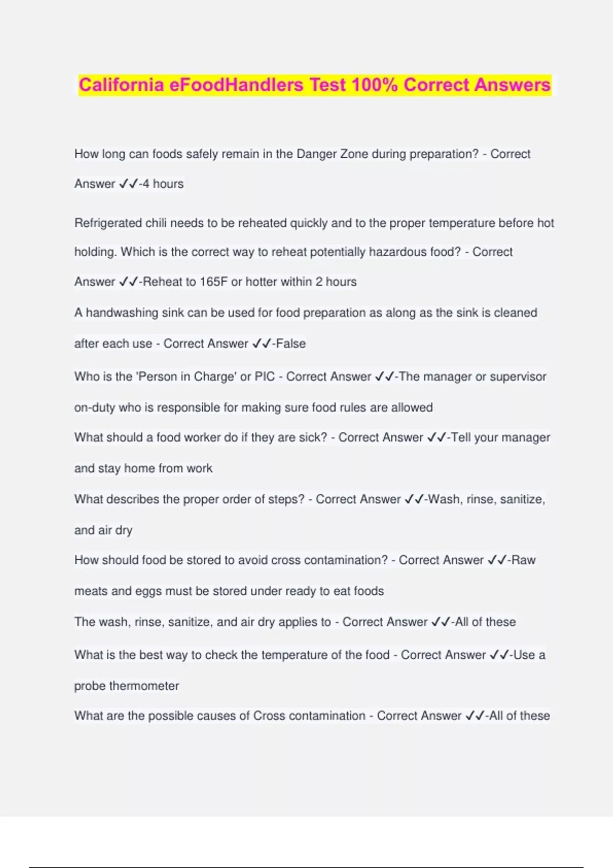 California ANSI Food Handler training Exam Questions and Answers 100% Pass