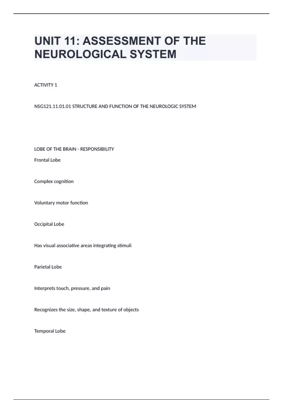 1 Exam (elaborations) NSG 121 Herzing University -Ch 15 Structure and Function of the Neurologic System answered to pass 2 Exam (elaborations) Finial HESI NSG 121 questions with 100% correct answers 3 Exam (elaborations) NSG 121 - Comprehensive Knowledge Check questions n answers rated A+ 4 Exam (elaborations) NSG 121 - Exam 1 with complete solu