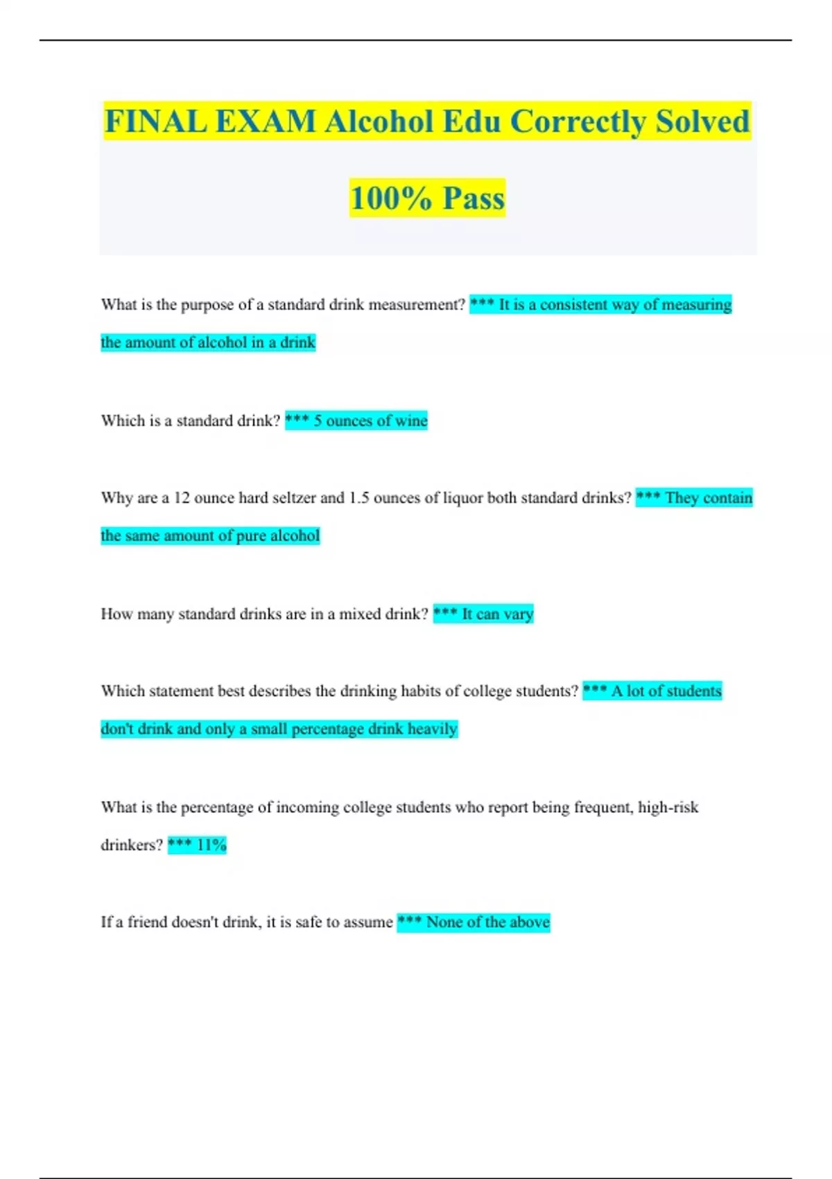 ALCOHOL Handling and Education Mixed Exam Work Book |100% Correct |