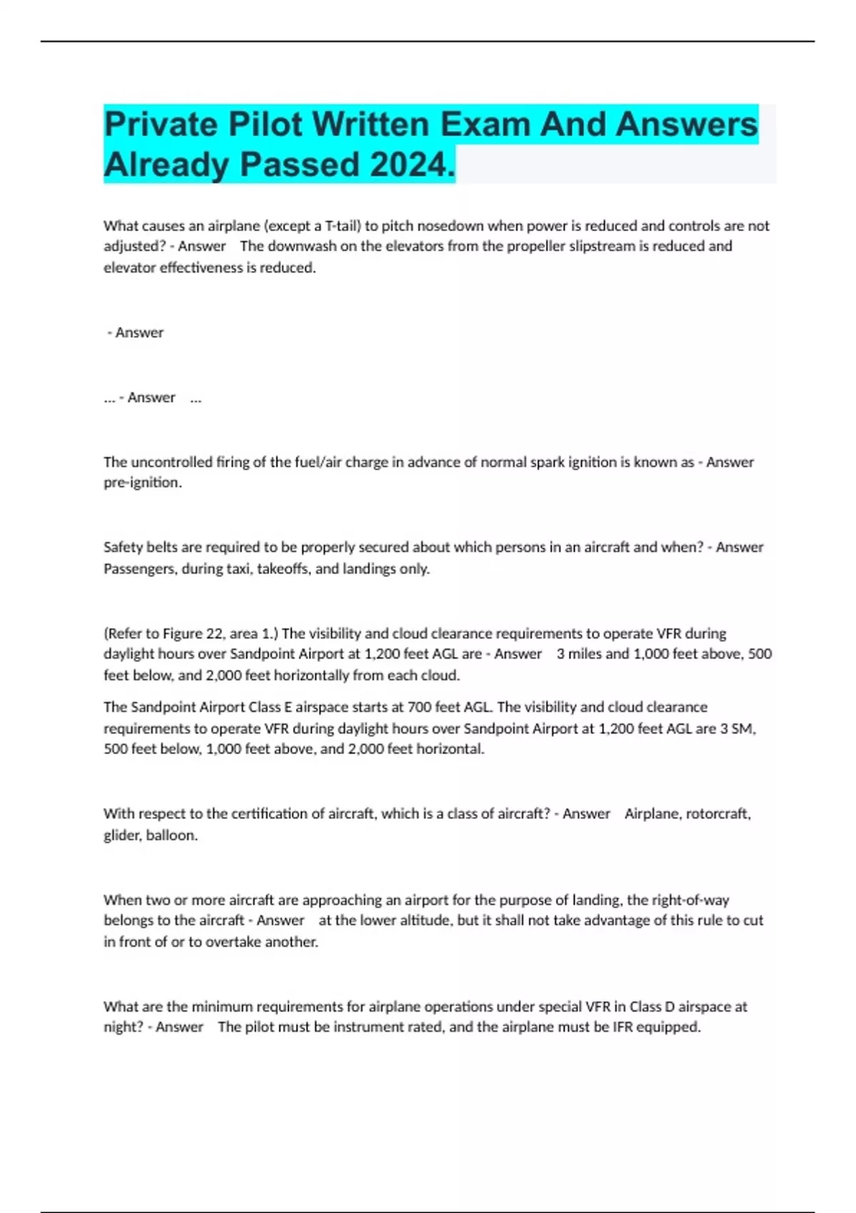 Private Pilot Prep Exam And Actual Answers 2024.