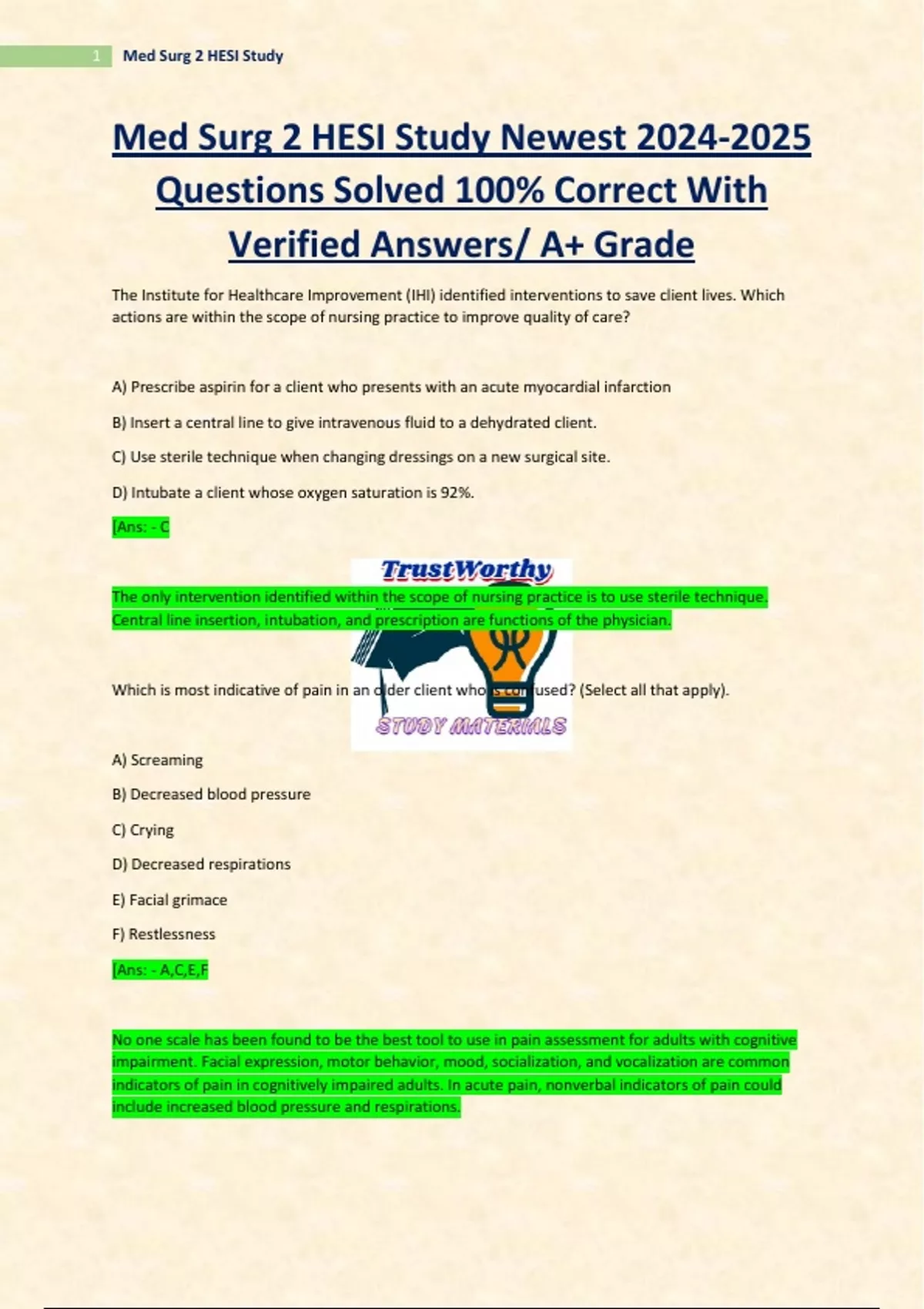 All Inclusive; Med Surg 2 HESI Study - Questions Solved 100% Correct With Detailed Verified Answers