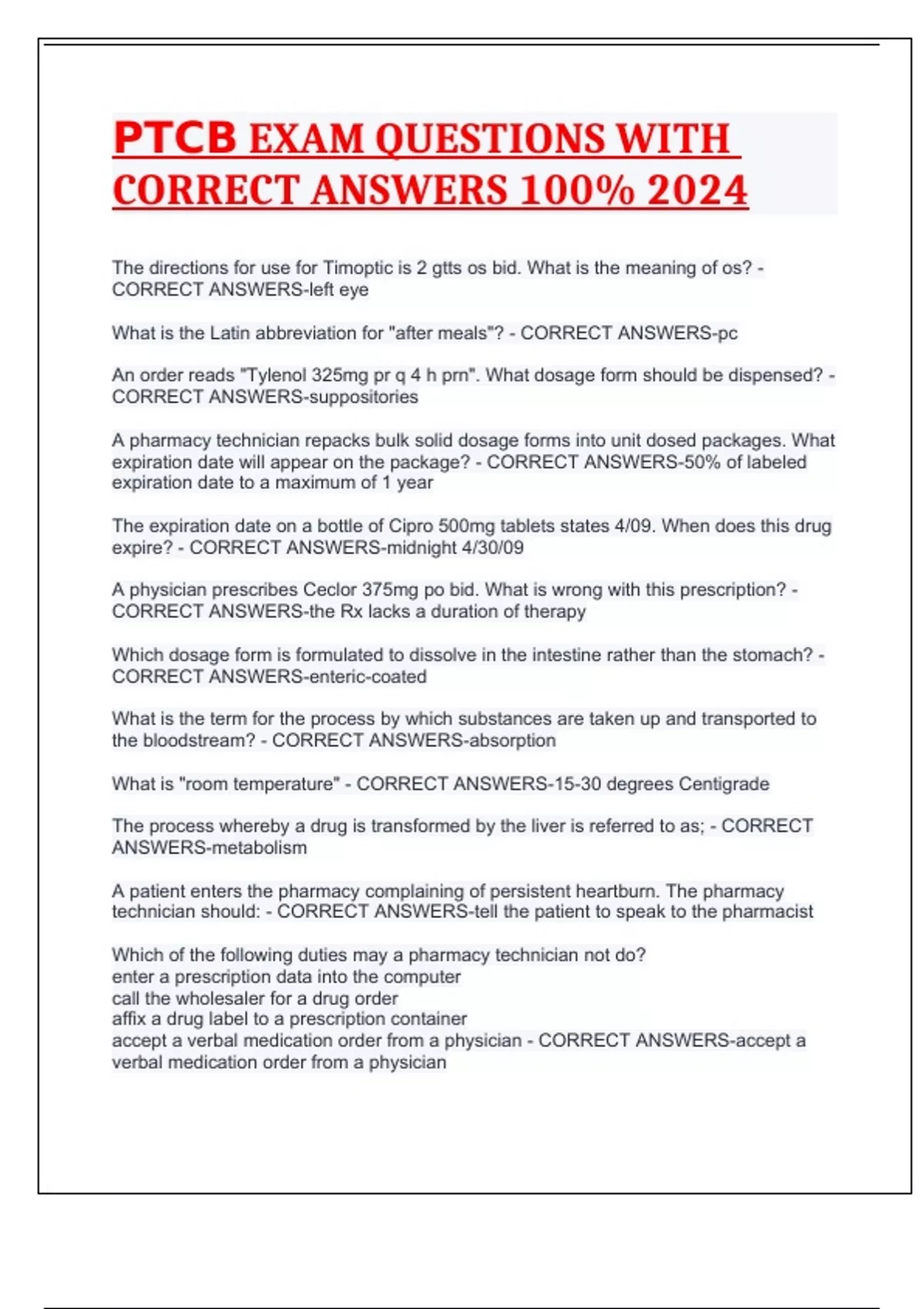 PTCB EXAM QUESTIONS WITH CORRECT ANSWERS 100% 2024 PTCB STUDY GUIDE PRACTICE EXAM QUESTIONS WITH CORRECT ANSWERS 100% 2024 PTCB EXAM QUESTIONS WITH CORRECT ANSWERS 100% 2024 PTCB PRACTICE EXAM QUESTION WITH CORRECT ANSWERS 100% 2024 PTCB EXAM PRACTICE TEST QUESTIONS WITH CORRECT ANSWERS 100% 2024 PTCB EXAM QUESTIONS WITH CORRECT ANSWERS 100% 2024