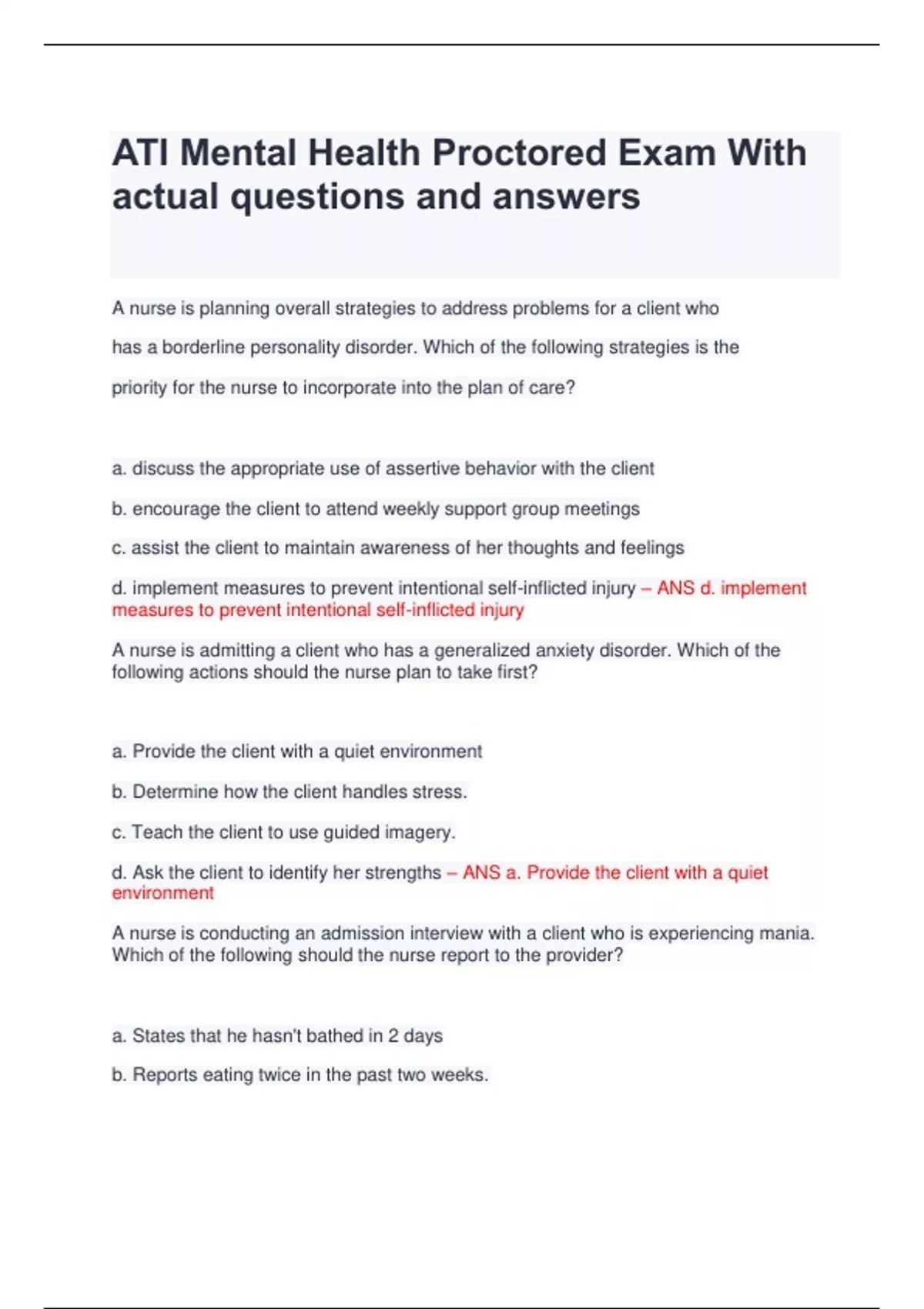 PACKAGE DEAL FOR ATI MENTAL HEALTH QUESTIONS AND ANSWERS