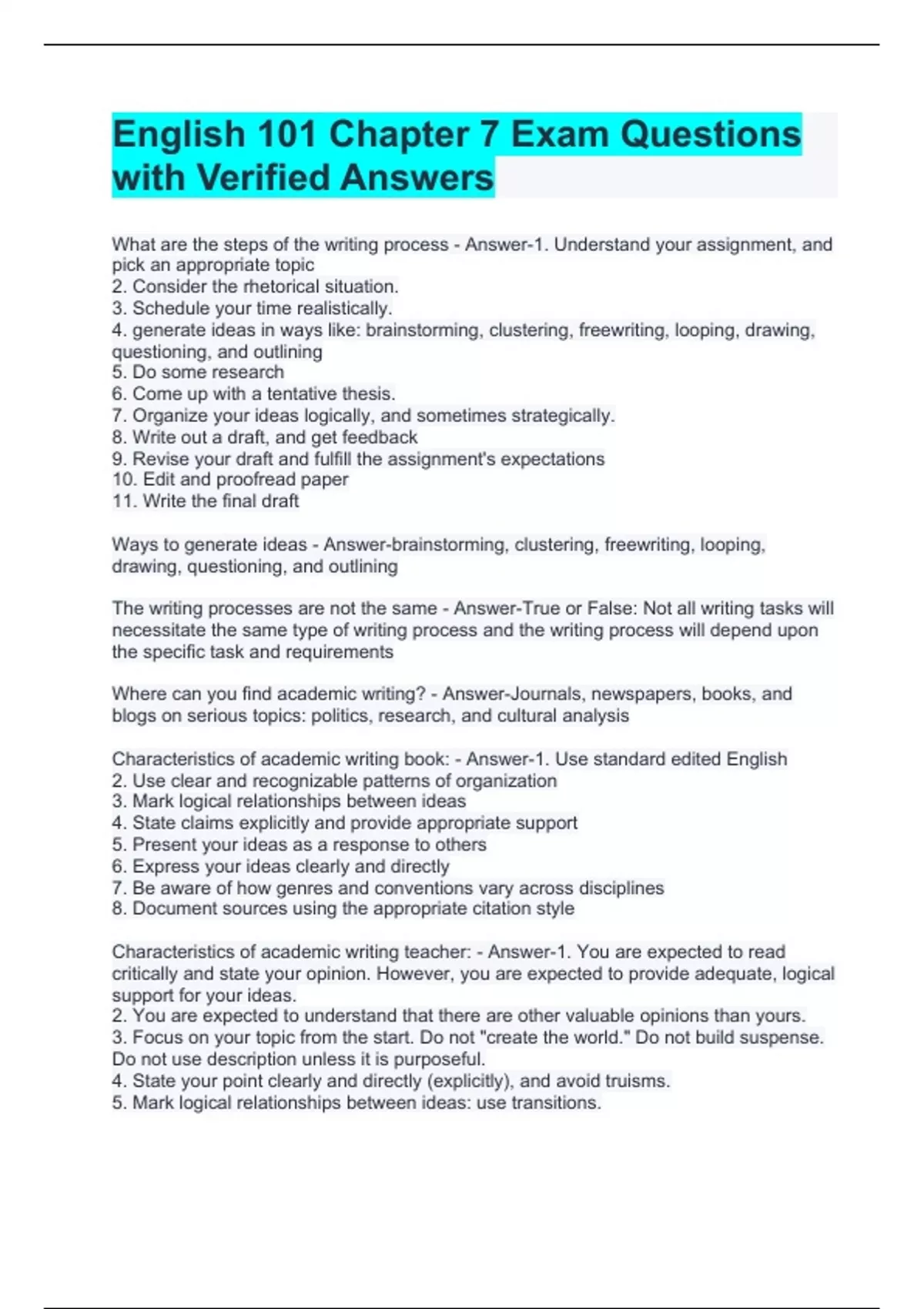 Exam (elaborations) English 101 Exam Questions with Latest Update Exam (elaborations) English 101 Exam Questions with Correct Answers Latest Update Exam (elaborations) English 101 Exam Questions with Complete Solutions Exam (elaborations) English 101 Essay Quiz Exam Questions and Answers Exam (elaborations) English 101 DE Writing Terms Exa