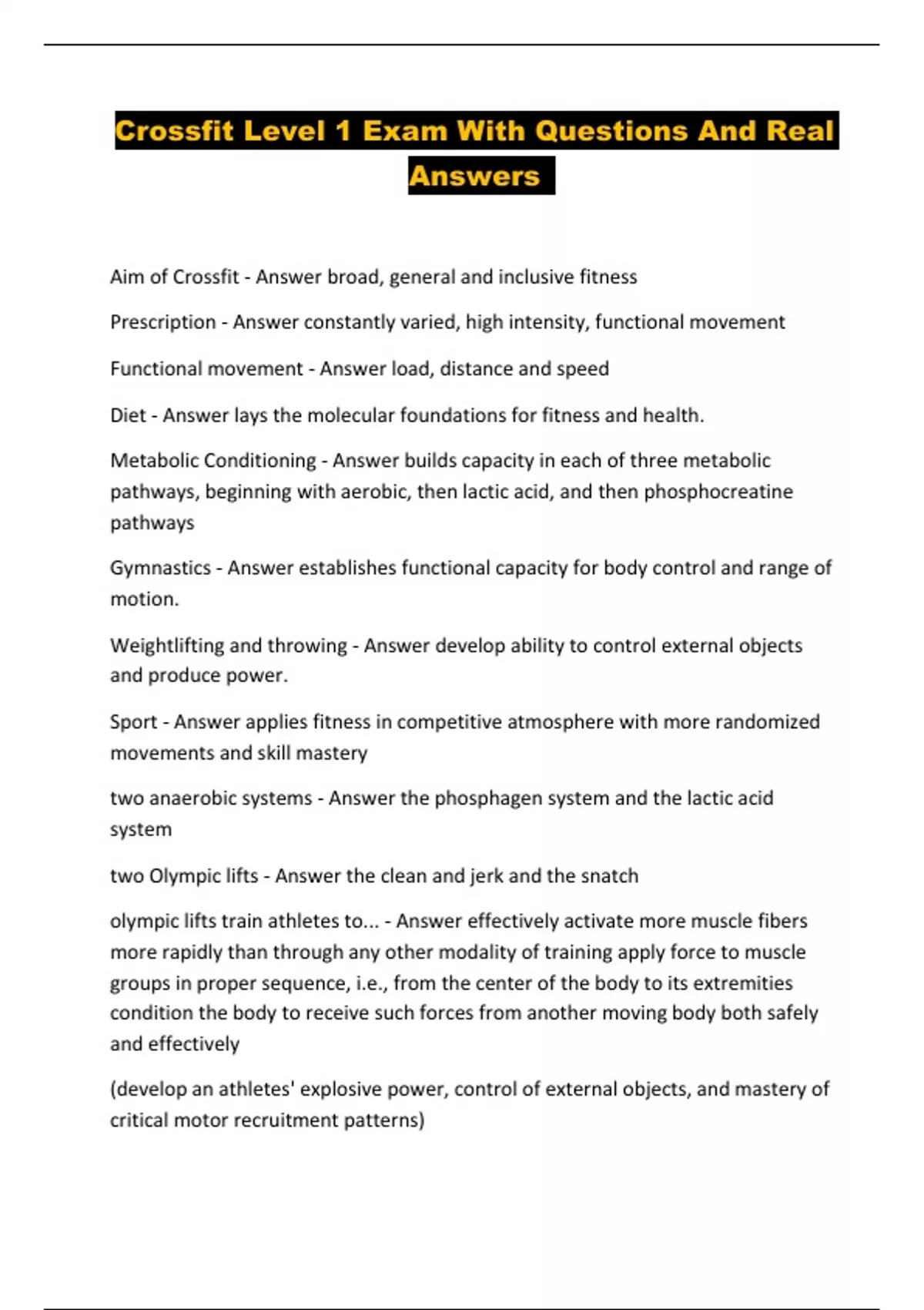 Crossfit, Crossfit level 1 certification Exam With Questions And Answers