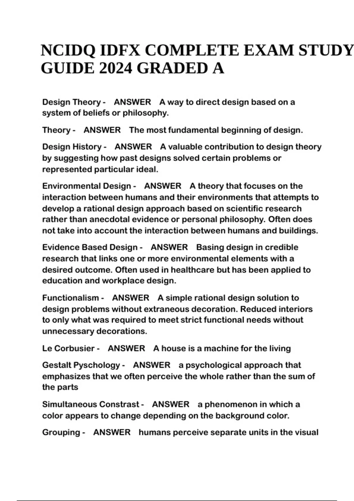 NCIDQ IDFX FINAL EXAM 2024 LATEST UPDATE VERSION, NCIDQ IDFX COMPLETE EXAM STUDY GUIDE 2024 GRADED A & IDFX - Programming and Site Analysis Exam (New Update) Questions and Verified Answers (RATED A).