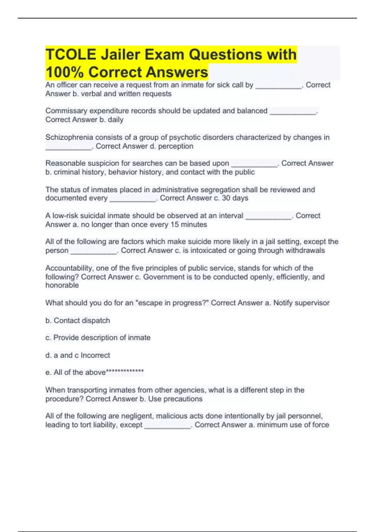 TCOLE Jailer Exam Questions with 100% Correct Answers Basic Jailer Course Practice Exam Questions with 100% Correct Answers TEEX Jailer Exam Review Questions with Correct Answers TCOLE Basic Jailer Exam Questions with 100% Correct Answers Jailers Test Exam Questions with 100% Correct Answers