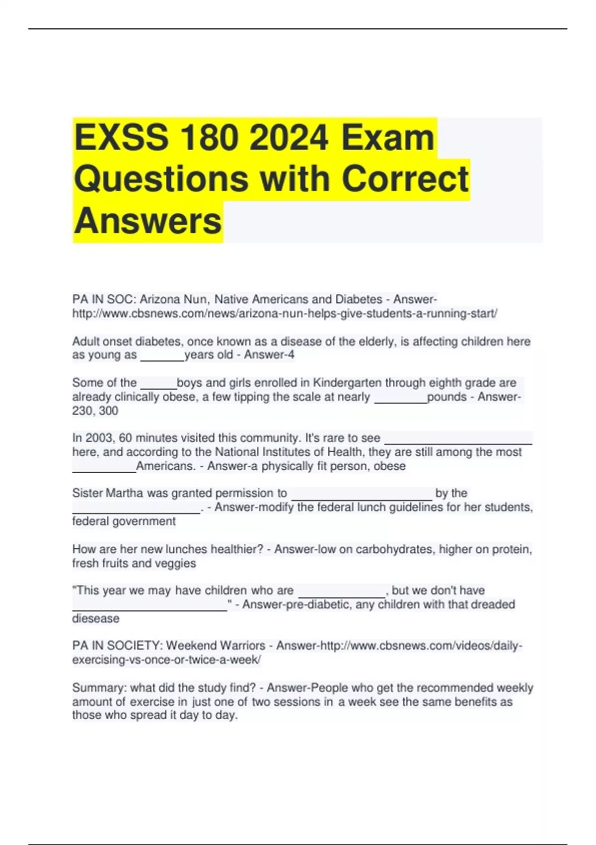 Exam (elaborations) EXSS 180 Test 1 Questions with Correct Answers 2 Exam (elaborations) EXSS 180 Final Exam with A Grade Solutions 3 Exam (elaborations) EXSS 180 Final Review Questions and Answers All Correct 4 Exam (elaborations) EXSS 180 Final Exam Questions with Answers All Correct 5 Exam (elaborations) EXSS 180 Exam with All Correct Answe