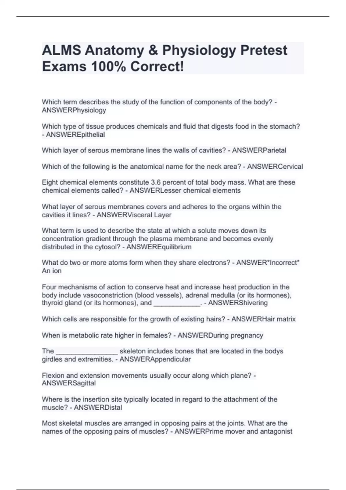ALMS Anatomy & Physiology Pretest Exams 100% Correct!