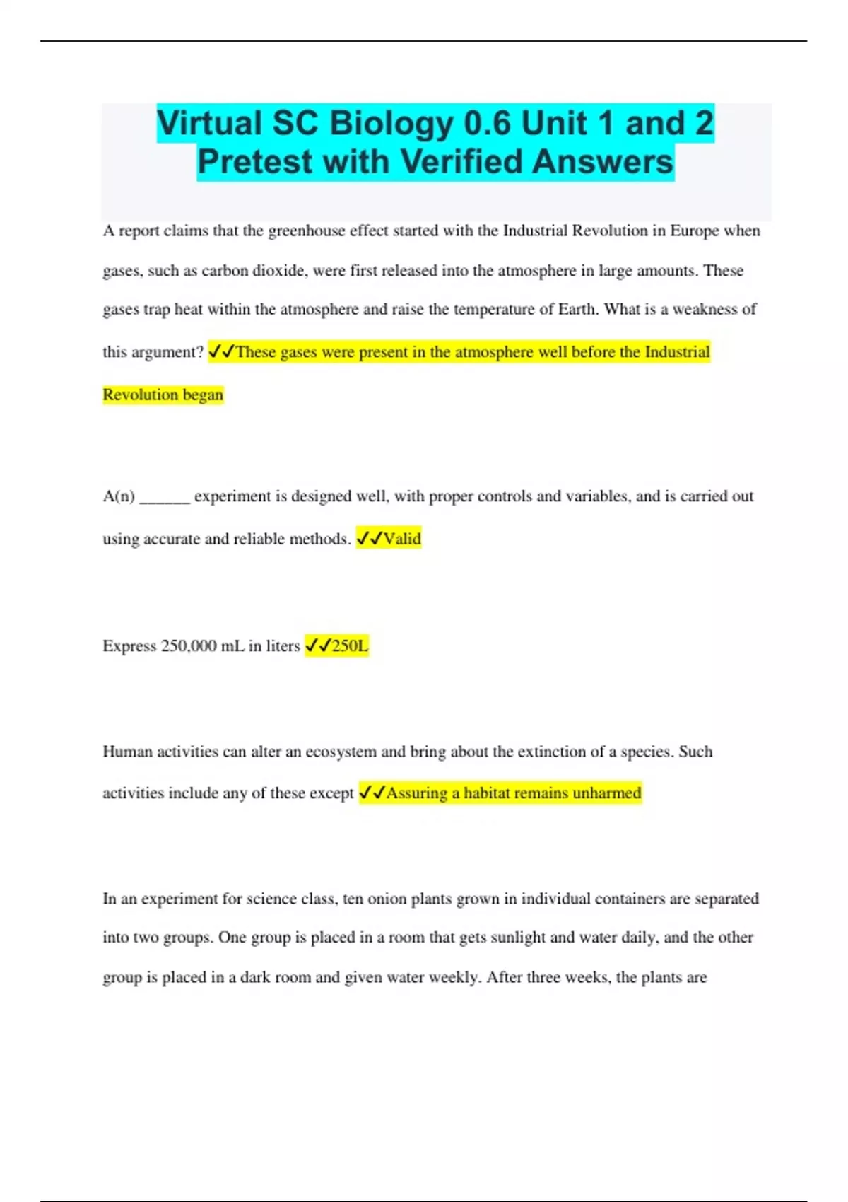 Virtual SC Biology 0.6 Unit 1 and 2 Pretest with Verified Answers