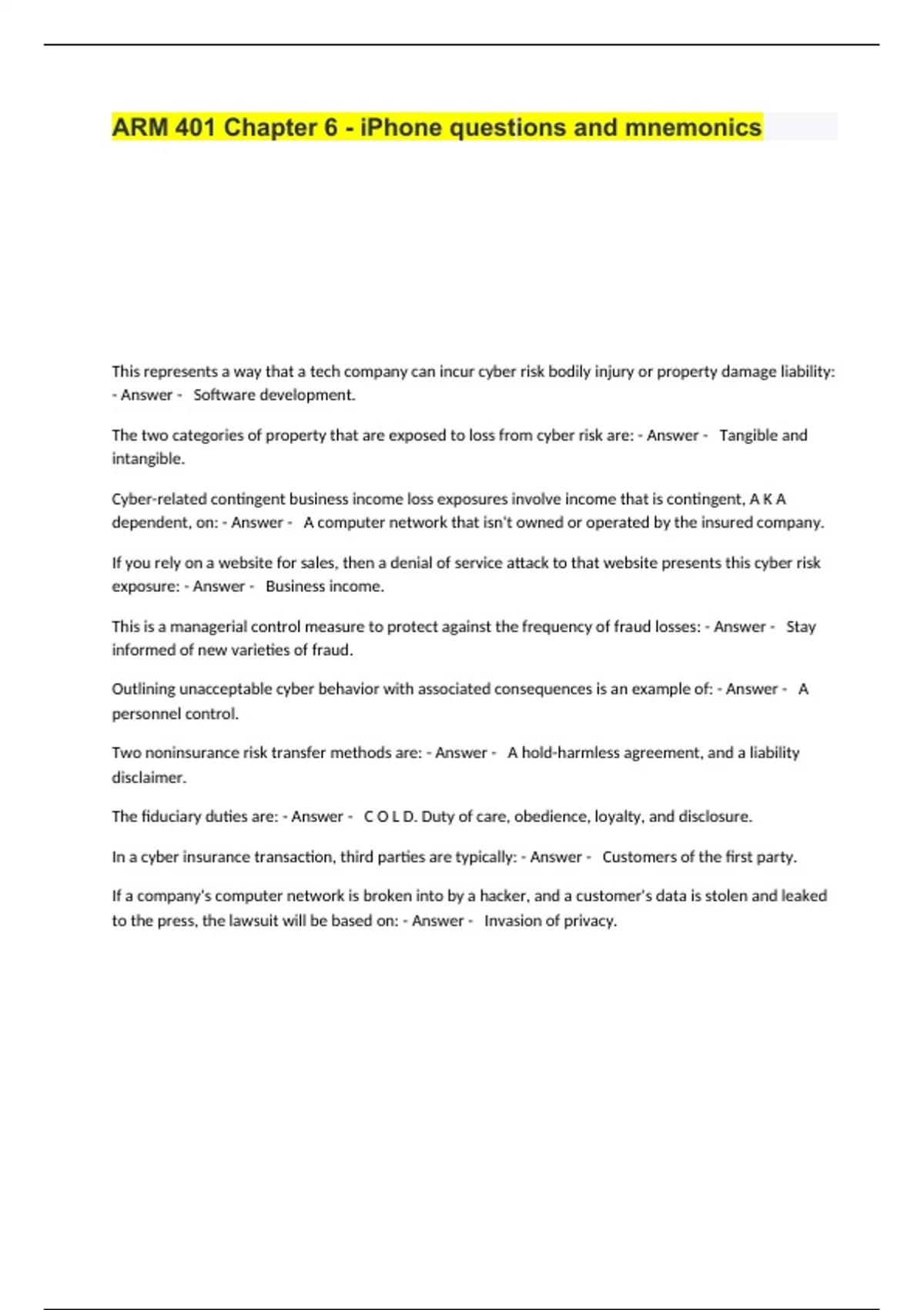 ARM 401 Assignment 1 - Identifying Risk Exam Questions with Correct Answers.