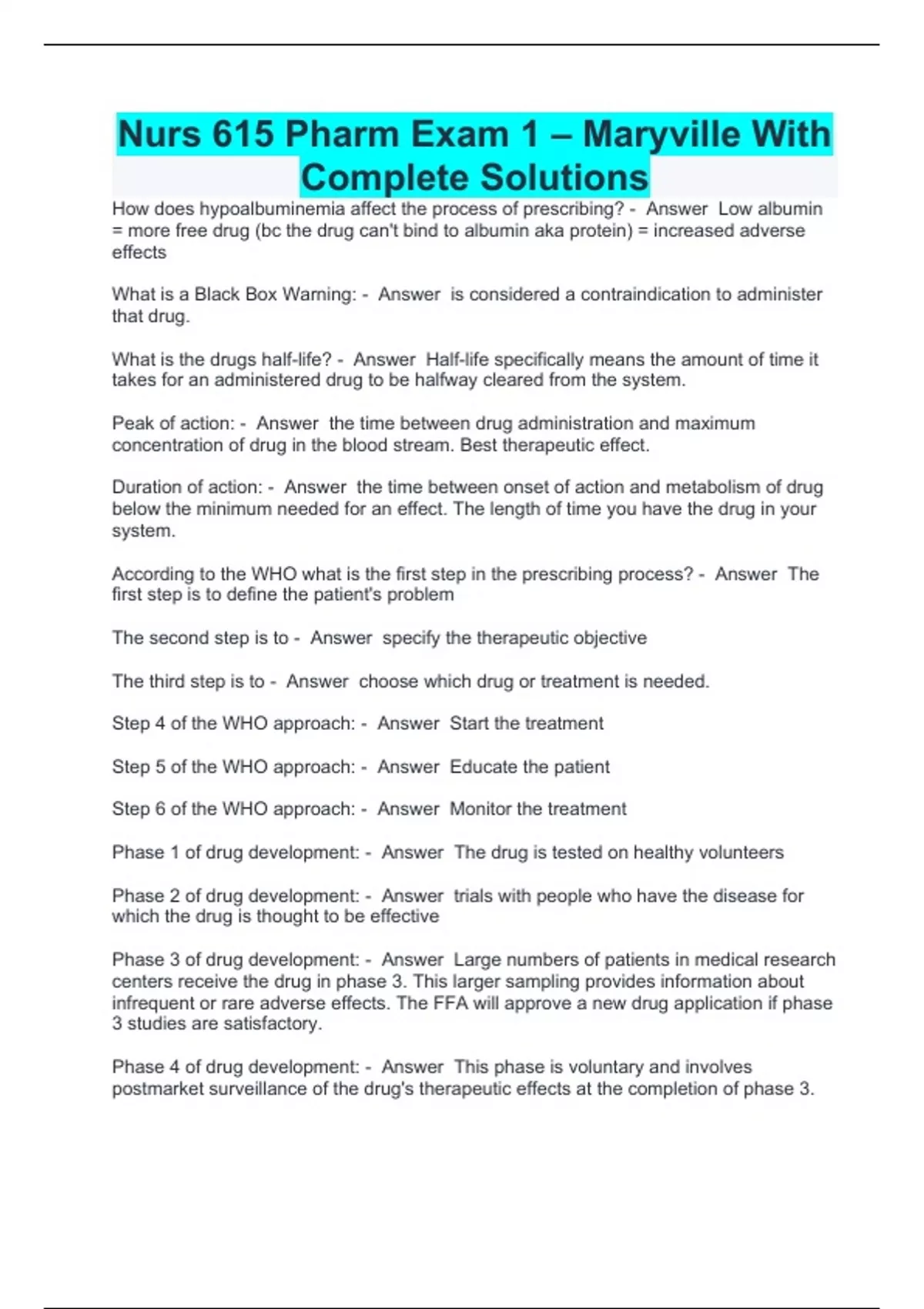 Nurs 615 Pharm Exam 1 – Maryville With Complete Solutions/Maryville NURS 615 Pharm Exam 2 Questions With Correct Answers 2024/2025/ Nurs 615 exam 1 Questions With Complete Solutions/Maryville NURS 615 Exam 3 Questions With Complete Solutions