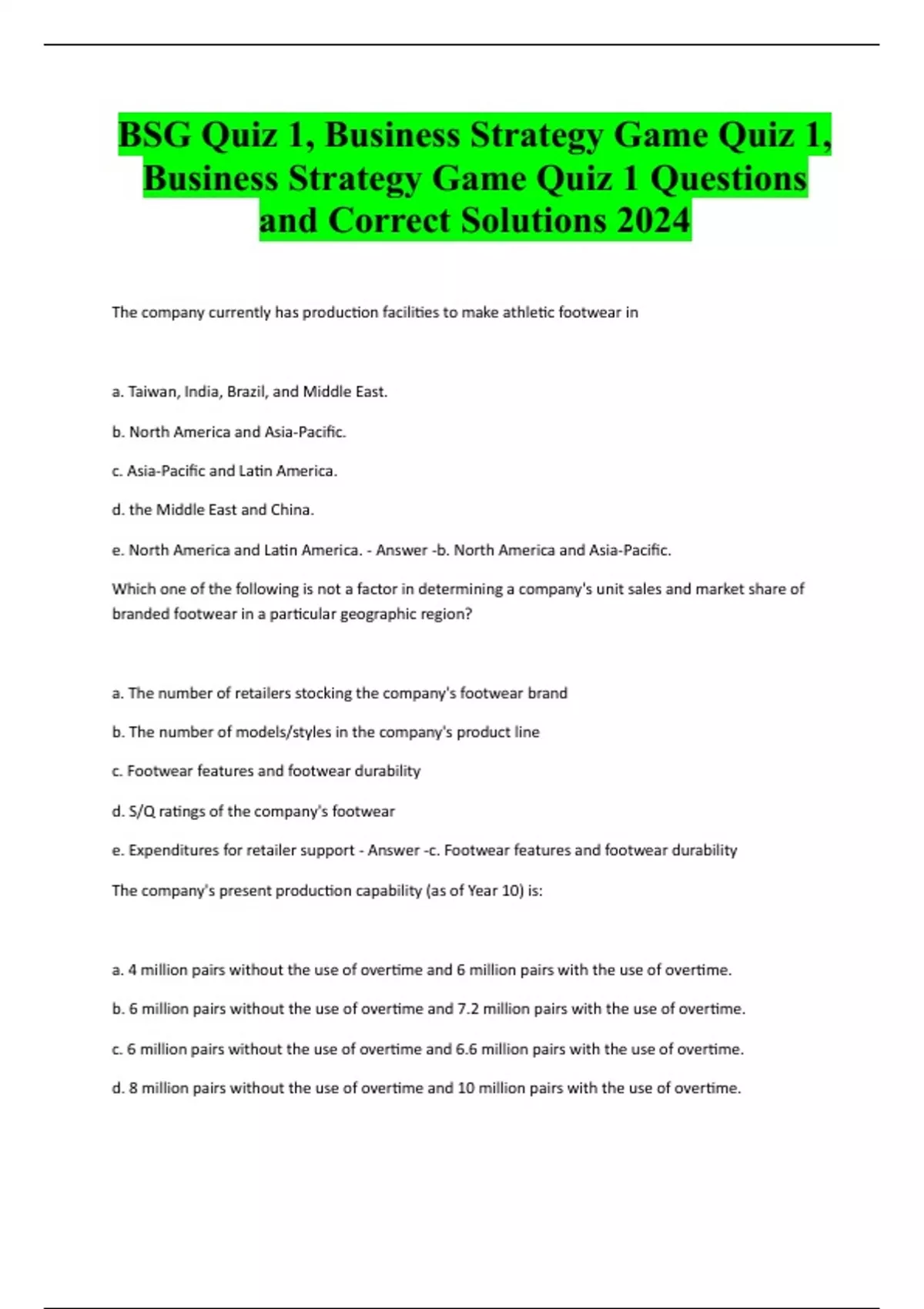 Bundle for BSG Quizzes Correctly Solved 2024 | 2025. Actual tests, Chapter 6 BSG, BSG Course, BSG final exam, BSG business strategy, BSG simulation