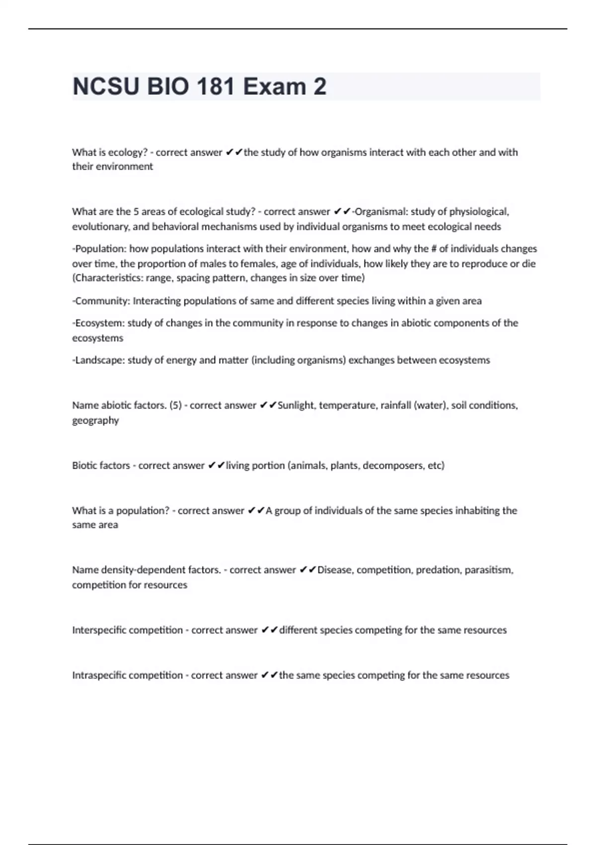 BIO 181 North Carolina State University -Bio 181 Exam 1 study guide well answered