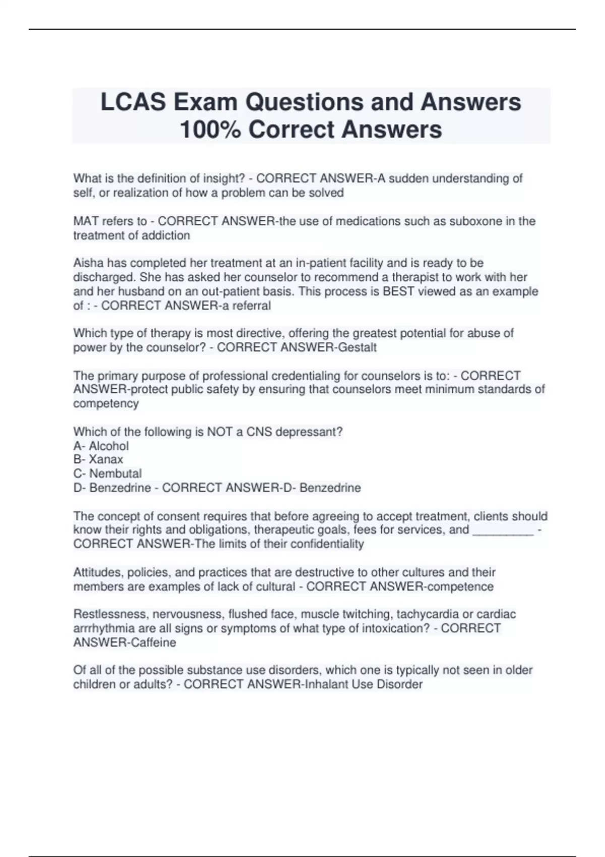 Study Guide for LCAS Final Complete Questions and Answers LCAS Exam Questions and Answers 100% Correct Answers LCAS Exam – NC Exam (questions and answers) verified Certified Clinical Supervisor exam (LCAS) Final Exam Lates LCAS Practice Test Exam Questions and Answers Certified Final Exam for LCAS Verified Questions and Answers LCAS Medication Assi