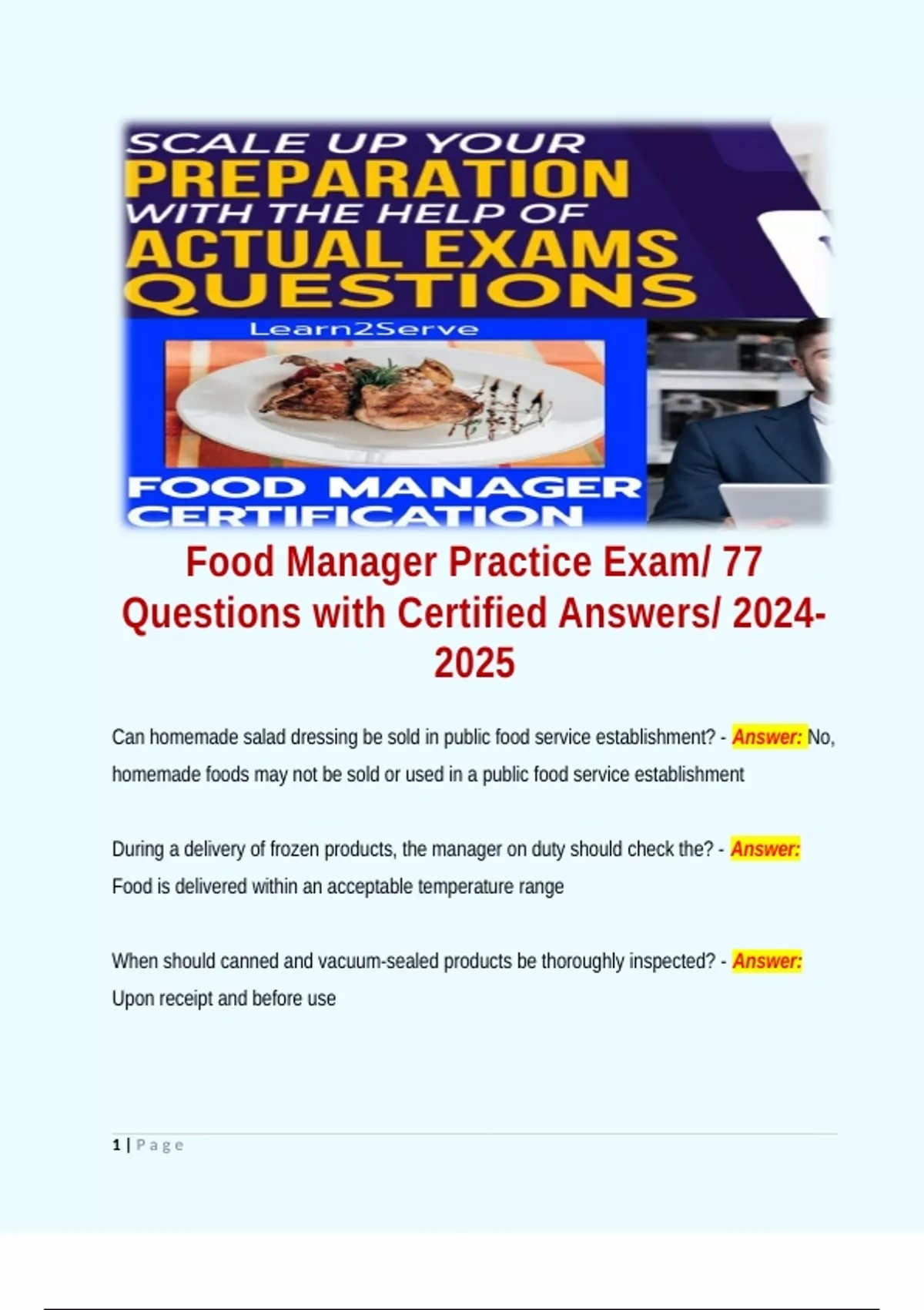 1 Exam (elaborations) ServSafe Manager Exam/ 111 Questions with Correct Answers/ . 2 Exam (elaborations) ServSafe Manager Exam/ 150 Quizzes & Answers 3 Exam (elaborations) ServSafe Manager Exam (35 Questions and Answers) . 4 Exam (elaborations) Servsafe Food Protection Manager Exam Review Containing 170 Questions with