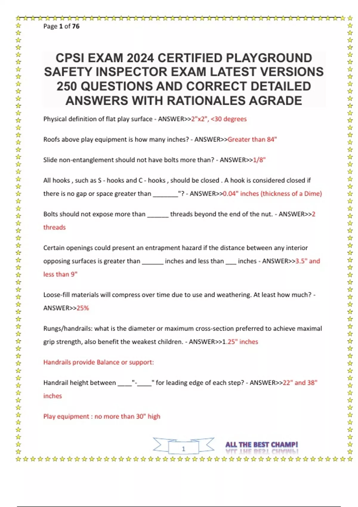 CPSI EXAM 2024 CERTIFIED PLAYGROUND SAFETY INSPECTOR EXAM LATEST VERSIONS 250 QUESTIONS AND CORRECT DETAILED ANSWERS WITH RATIONALES AGRADE