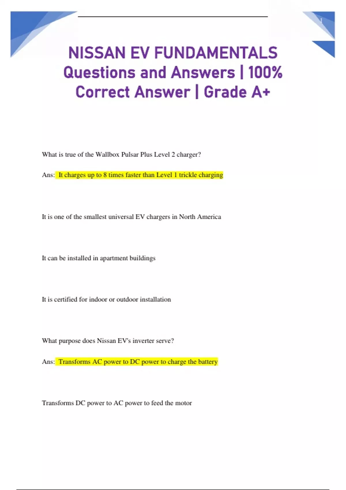 NISSAN EV FUNDAMENTALS Questions and Answers Pack| 100% Correct Answer | Grade A+
