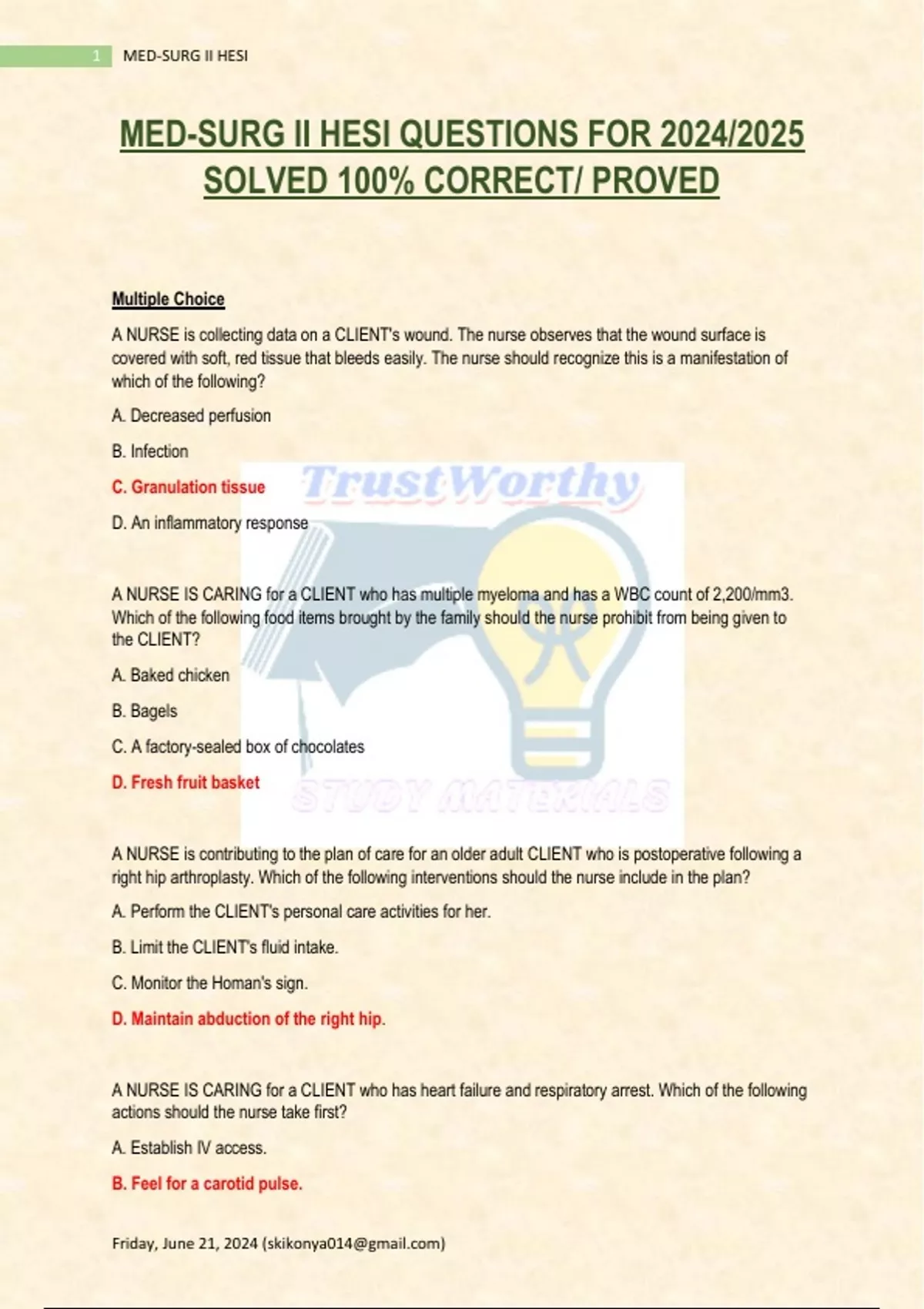 Complete; HESI MED SURGE II TEST BANK SOLVED 100% WITH CORRECT ANSWERS / PROVED