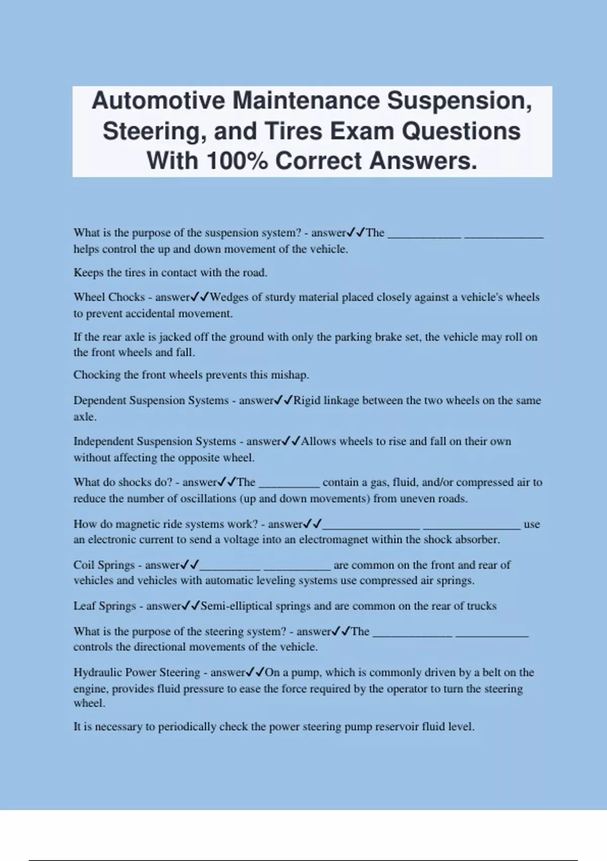 Automotive Maintenance Suspension, Steering, and Tires Exam Questions With 100% Correct Answers.