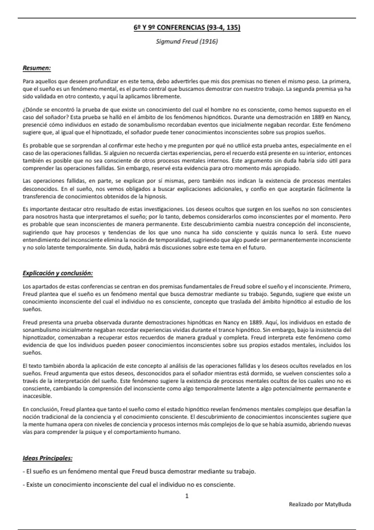 Resúmenes de los textos: “Lo inconsciente (cap. II, IV, V, VI, VII)”; “6º y 9º Conferencias”; “22º y 23º Conferencias”; “Pulsiones y destinos de pulsión”; "Puntualizaciones psicoanalíticas sobre un caso de paranoia descrito autobiográficamente (Schreber) (cap. III)"; y “De la historia de una neurosis infantil ("Hombre de los Lobos") (cap. IV y VII)