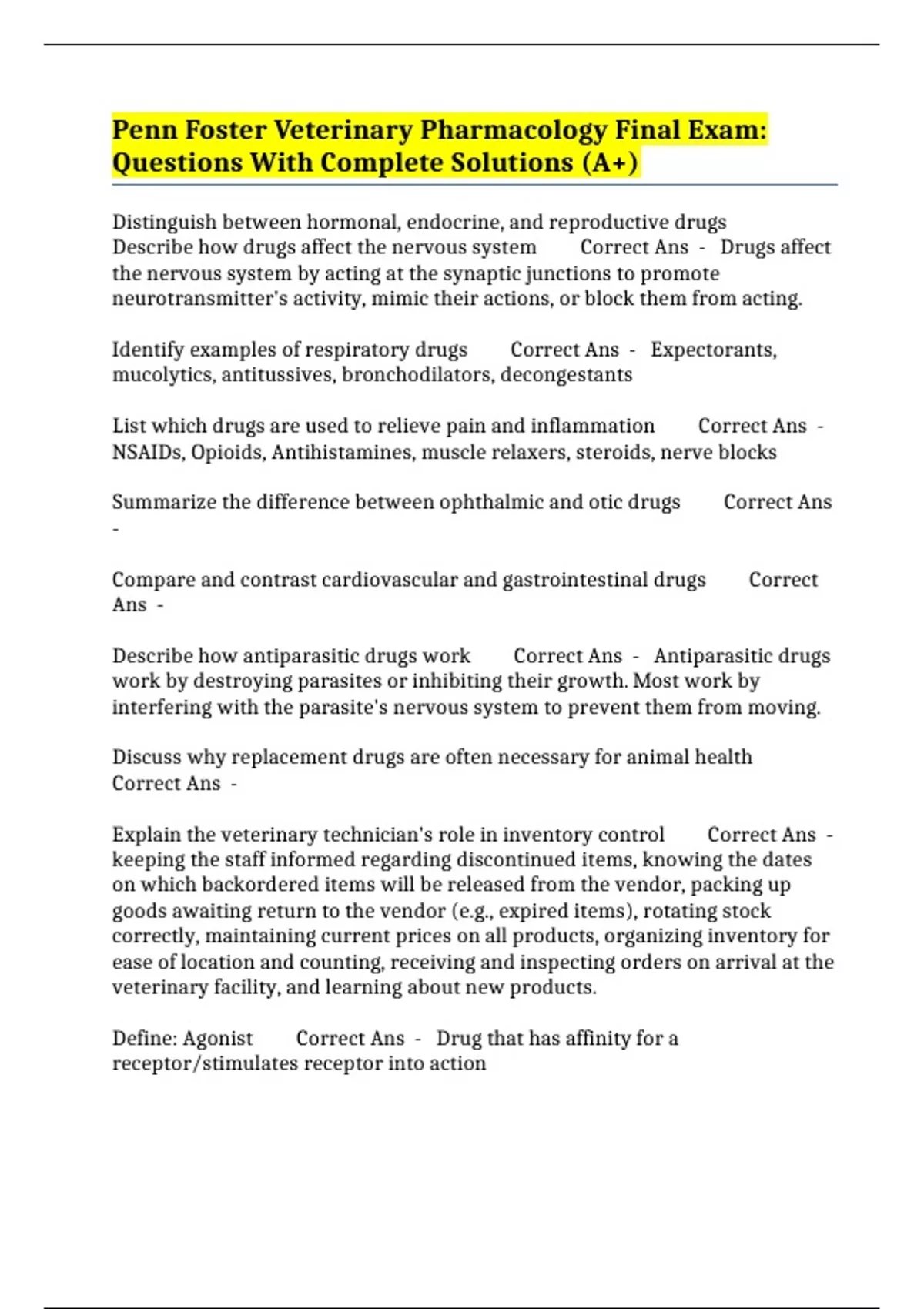 PACKAGE::- PENN FOSTER VETERINARY PHARMACOLOGY EXAMS