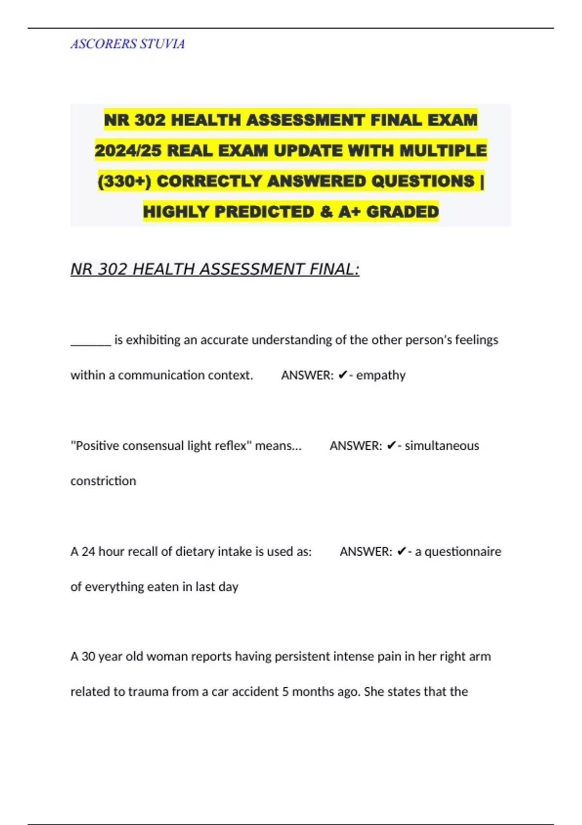 NR 302 HEALTH ASSESSMENT FINAL EXAMS 2024/25 PACKAGED HERE!!!