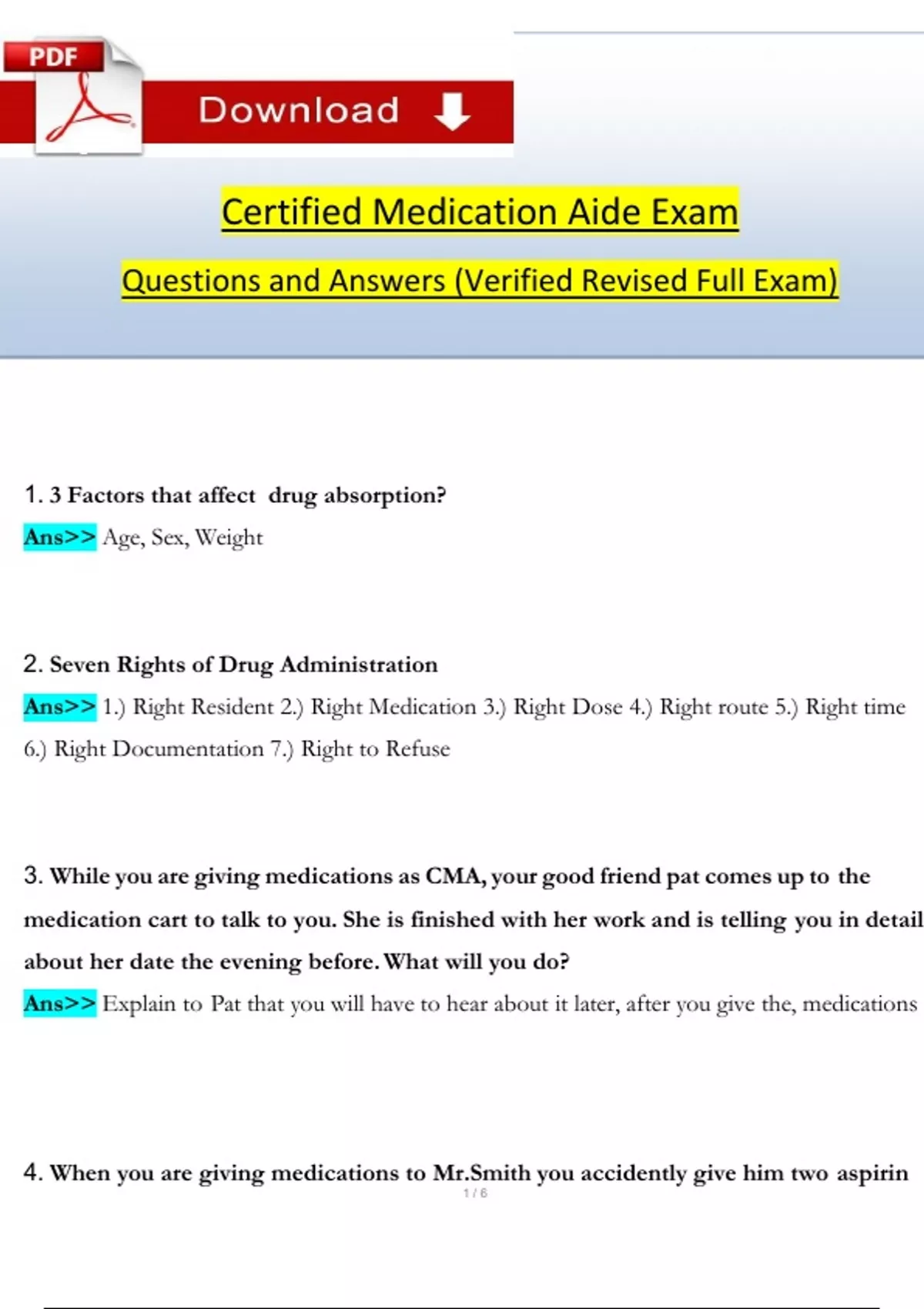 Certified Medication Aide Exam Review Questions and Verified Answers (2024 / 2025) 100% Guarantee Pass