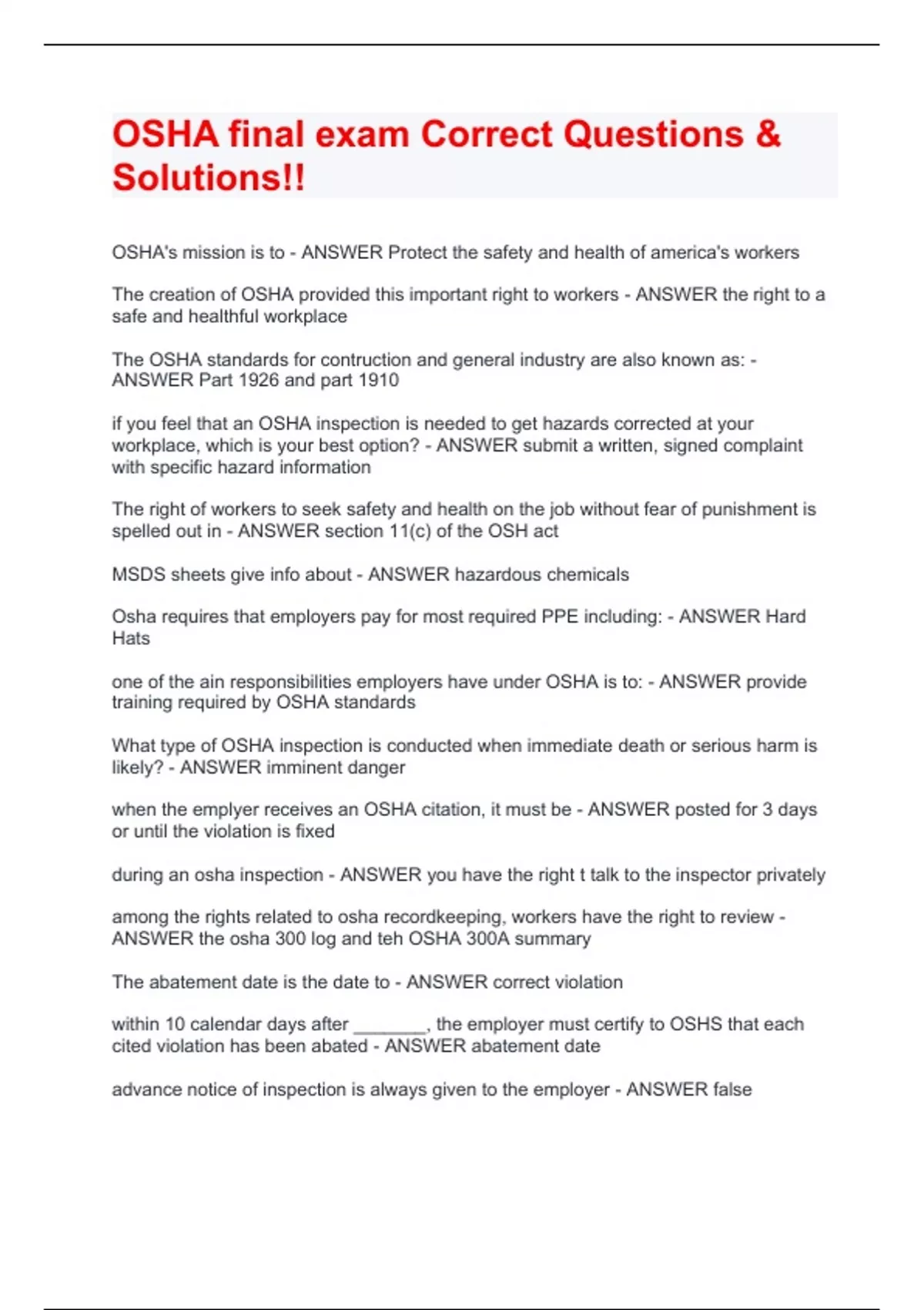 OSHA FINAL EXAM CORRECT QUESTIONS & ANSWERS(RATED A)COMPLETE EXAM BUNDLE
