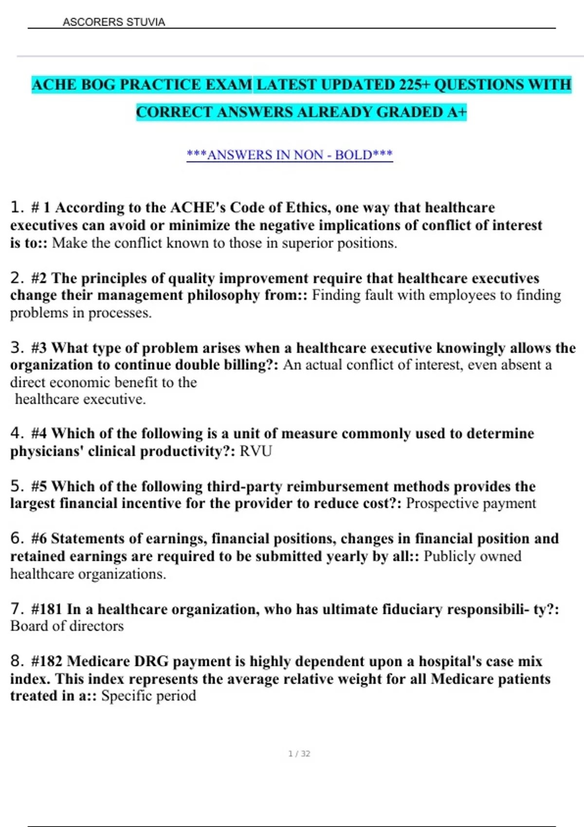 ACHE BOG EXAM NEWEST UPDATE WITH 115 MULTIPLE CHOICE QUESTIONS HIGHLY PREDICTED & ANSWERED CORRECTLY |A GRADED ACHE BOG PRACTICE EXAM LATEST UPDATED 225 QUESTIONS WITH CORRECT ANSWERS ALREADY GRADED A ACHE - BOG EXAM 2023/24 70 QUESTIONS WITH CORRECT SOLUTIONS ALREADY GRADED A