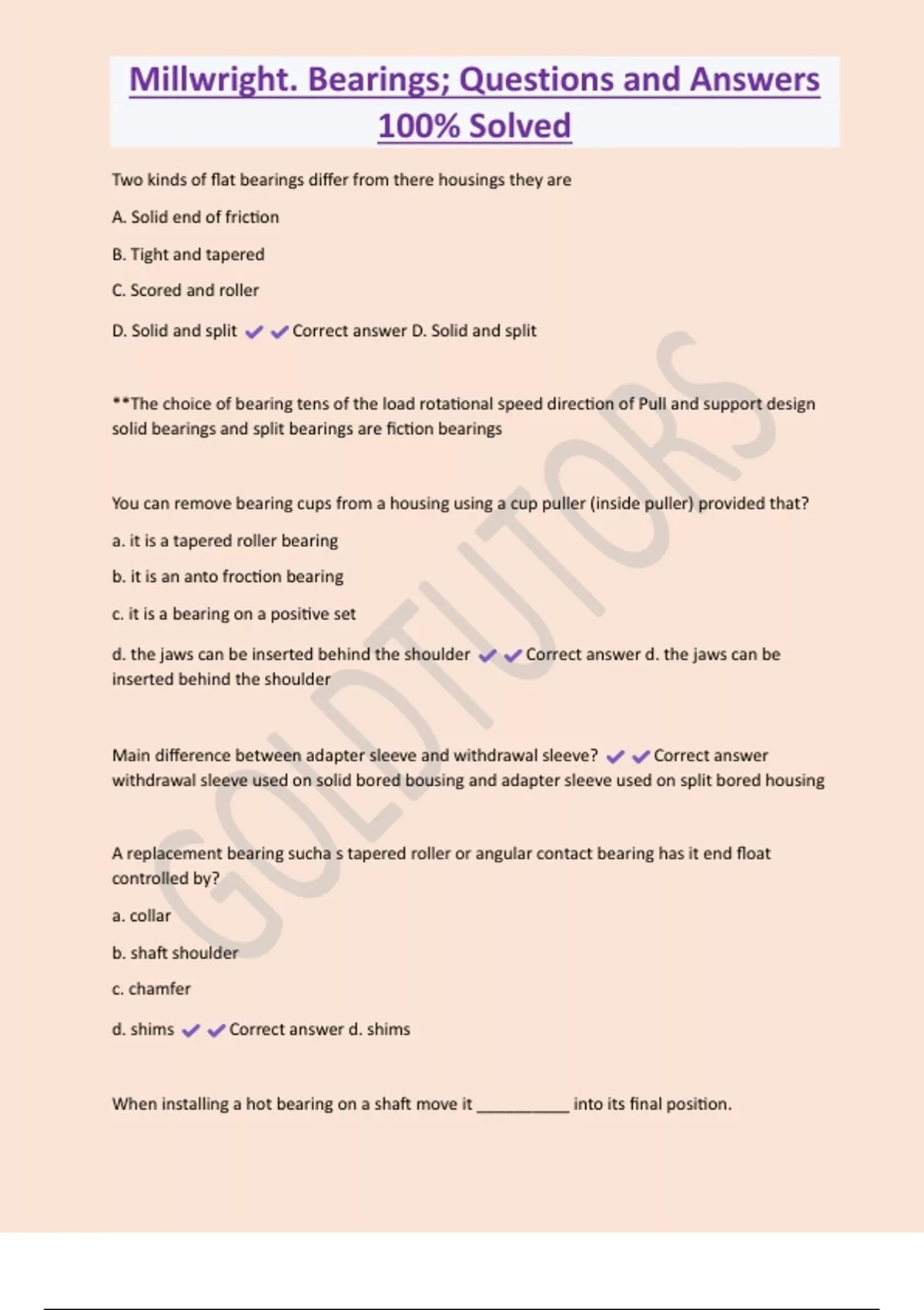 MILLWRIGHT FASTENERS TEST REVIEW LEVEL 1; EXAM WITH COMPLETE SOLUTIONS 100% VERIFIED 2 Exam (elaborations) Intro to Millwright Exam; Questions and Answers 100% Solved 3 Exam (elaborations) Millwright - Hydraulics Math; Questions and Answers 100% Solved 4 Exam (elaborations) Millwright - Power Transmission; Questions and Answers 100% Solved 5 Ex