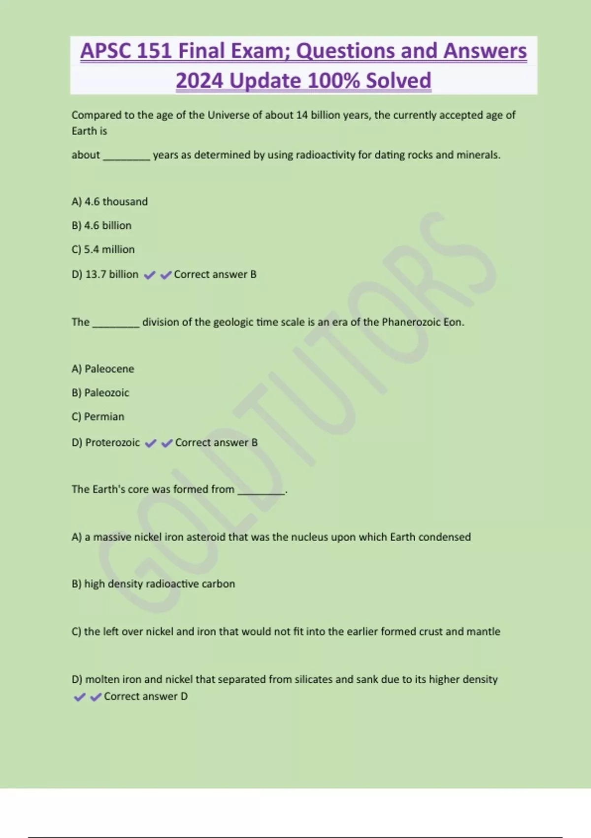 APSC 151 Exam (Engineering Geology and the Biosphere); Questions and Answers 100% Solved 3 Exam (elaborations) APSC 151 Exam Prep; Questions and Answers 2025/2024 Update 100% Solved 4 Exam (elaborations) APSC 151 Exam; Questions and Answers 100% Solved 5 Exam (elaborations) APSC 151 Exam; Questions and Answers 100% Solved Exam (elaborations)