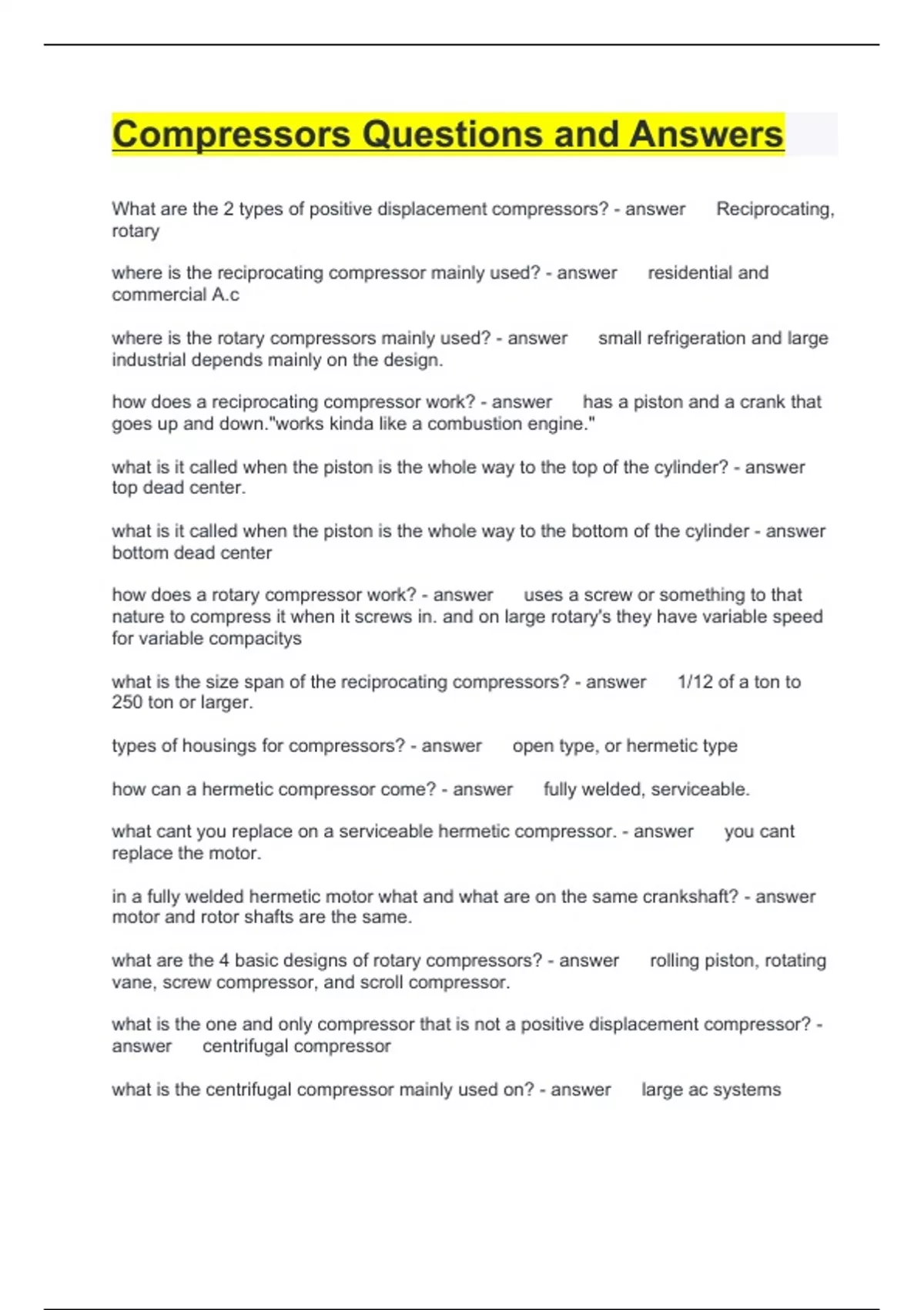 Exam (elaborations) Ch 5. Compressors Questions and Answers Exam (elaborations) Chapter 7 compressors Questions and Answers Exam (elaborations) Refrigeration Compressors Questions and Answers Exam (elaborations) unit 13 Questions and Answers Exam (elaborations) Air compressor test Questions and Answers Exam (elaborations) Chapter 5 – Co