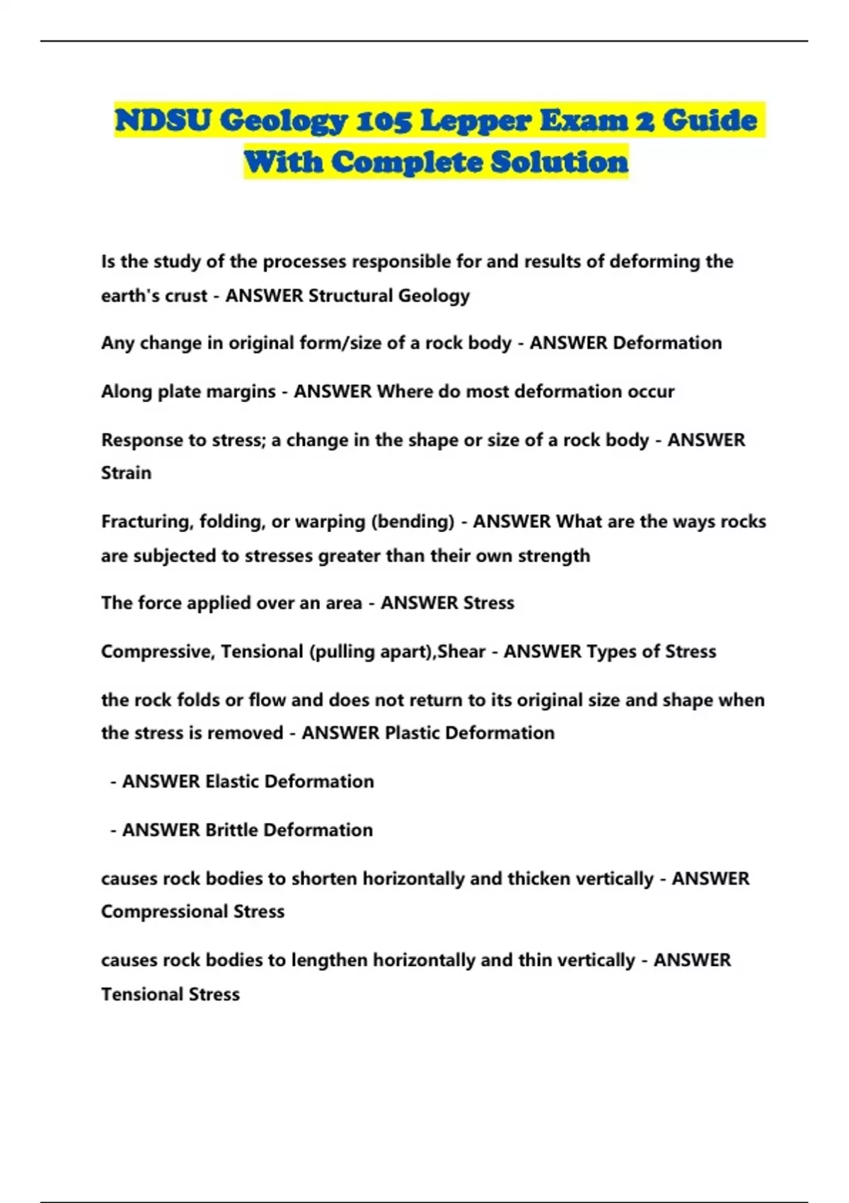 NDSU Geology 105 Lepper Exam 2 Guide With Complete Solution