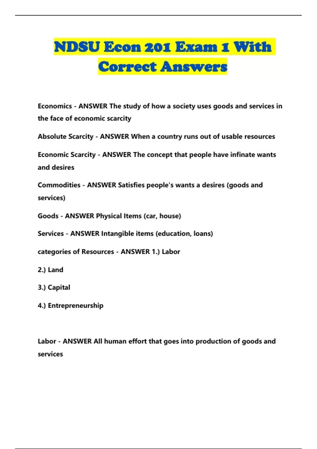NDSU Econ 201 Exam 1 With Correct Answers