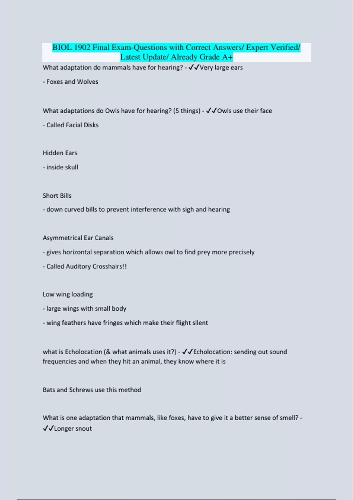 BIOL 1902 EXAMS BUNDLE-Questions with Correct Answers/ Latest Update/ Complete And Accurate / 100% Pass